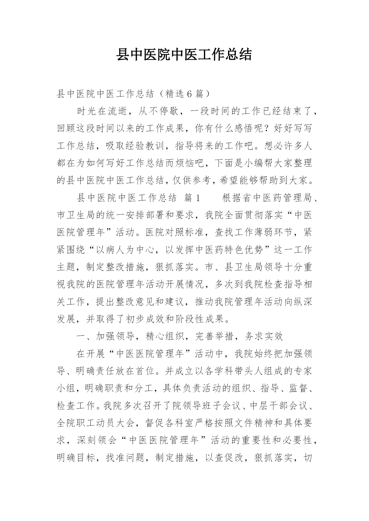县中医院中医工作总结县中医院中医工作总结(精选6篇)时光在流逝,从不停歇,一段时间的工作已经结束了,回顾这段时间以来的工作成果,你有什么感悟呢?好好写写工作总结,吸取经验教训,指导将来的工作吧。想必许多人都在为如何写好工作总结而烦恼吧,下面是小编帮大家整理的县中医院中医工作总结,仅供参考,希望能够帮助到大家。县中医院中医工作总结篇1根据省中医药管理局、市卫生局的统一安排部署和要求,我院全面贯彻落实“中医医院管理年”活动。医院对照标准,查找工作薄弱环节,紧紧围绕“以病人为中心,以发挥中医药特色优势”这一工作