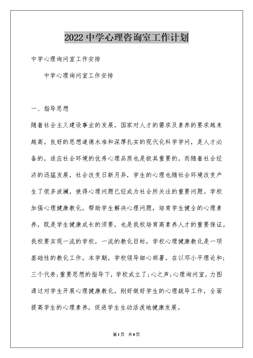 2022中学心理咨询室工作计划中学心理询问室工作安排中学心理询问室工作安排一、指导思想随着社会主义建设事业的发展国家对人才的需求及素养的要求越来越高。良好的思想道德水准和深厚扎实的现代化科学学问是人才必备的适应社会环境的优秀心理品质也是极其重要的而随着社会经济的迅
