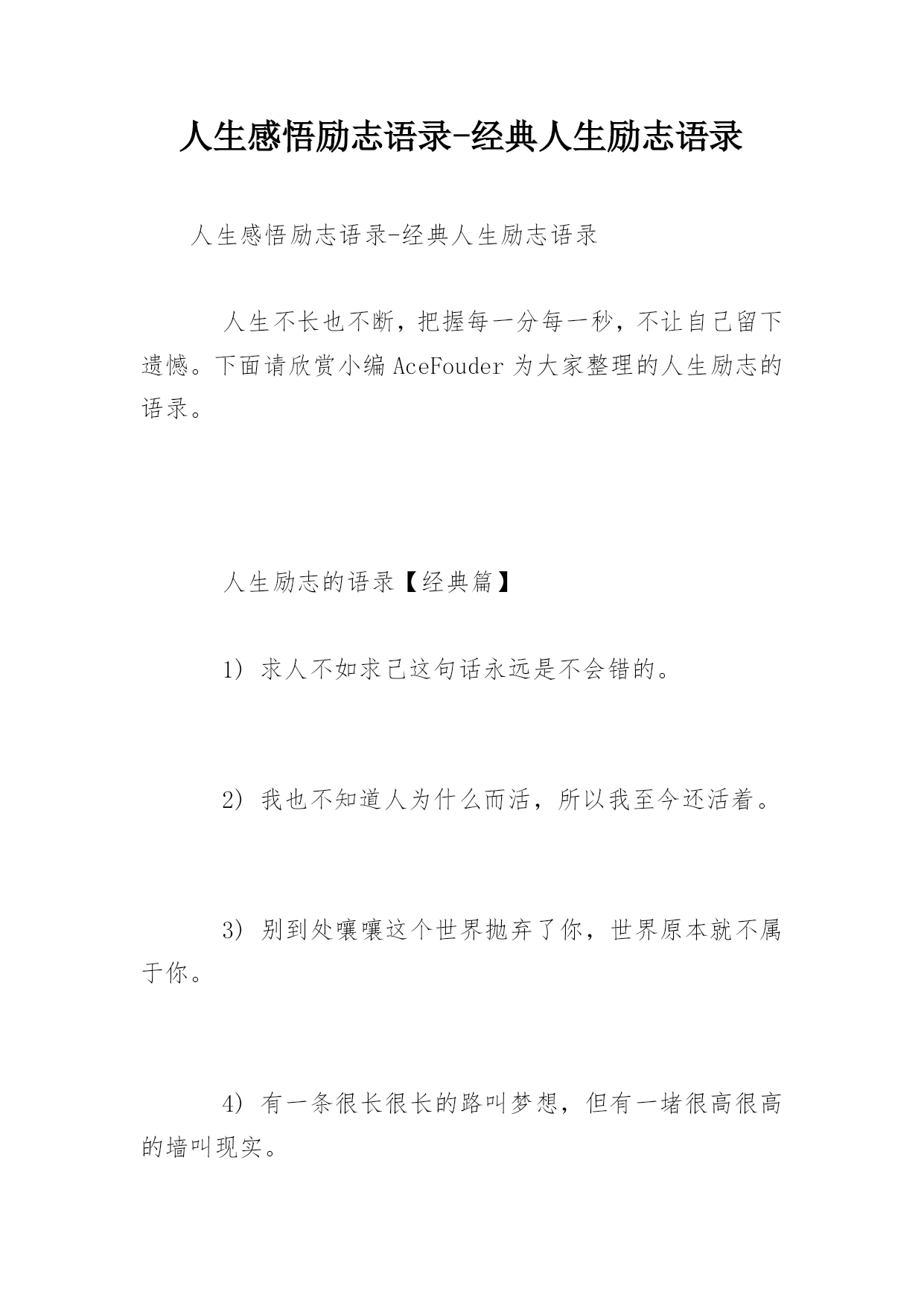 人生感悟励志语录-经典人生励志语录人生感悟励志语录-经典人生励志语录人生不长也不断,把握每一分每一秒,不让自己留下遗憾。下面请欣赏小编AceFouder为大家整理的人生励志的语录。人生励志的语录【经典篇】1)求人不如求己这句话永远是不会错的。2)我也不知道人为什么而活,所以我至今还活着。3)别到处嚷嚷这个世界抛弃了你,世界原本就不属于你。4)有一条很长很长的路叫梦想,但有一堵很高很高的墙叫现实。5)通向梦想的.路上的确有一道高墙,但它只阻挡不够热爱的人。6)那些所谓梦想的东西,被岁月打上一枚又一枚的标签。