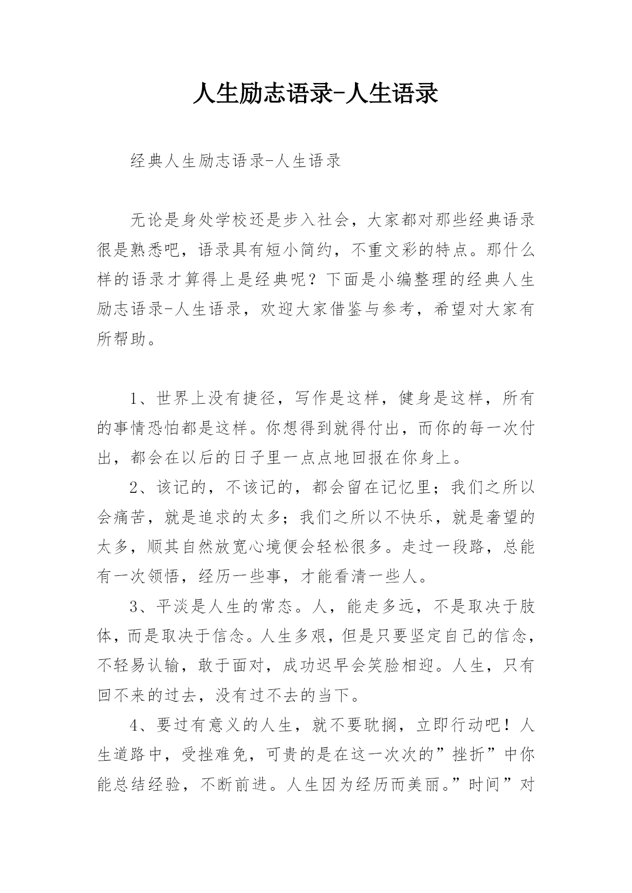 人生励志语录-人生语录经典人生励志语录-人生语录无论是身处学校还是步入社会,大家都对那些经典语录很是熟悉吧,语录具有短小简约,不重文彩的特点。那什么样的语录才算得上是经典呢?下面是小编整理的经典人生励志语录-人生语录,欢迎大家借鉴与参考,希望对大家有所帮助。1、世界上没有捷径,写作是这样,健身是这样,所有的事情恐怕都是这样。你想得到就得付出,而你的每一次付出,都会在以后的日子里一点点地回报在你身上。2、该记的,不该记的,都会留在记忆里;我们之所以会痛苦,就是追求的太多;我们之所以不快乐,就是奢望的太多,顺