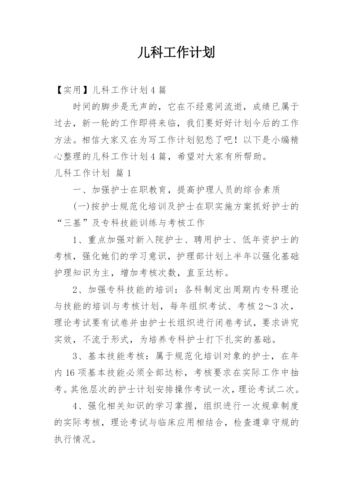 儿科工作计划【实用】儿科工作计划4篇时间的脚步是无声的,它在不经意间流逝,成绩已属于过去,新一轮的工作即将来临,我们要好好计划今后的工作方法。相信大家又在为写工作计划犯愁了吧!以下是小编精心整理的儿科工作计划4篇,希望对大家有所帮助。儿科工作计划篇1一、加强护士在职教育,提高护理人员的综合素质(一)按护士规范化培训及护士在职实施方案抓好护士的“三基”及专科技能训练与考核工作1、重点加强对新入院护士、聘用护士、低年资护士的考核,强化她们的学习意识,护理部计划上半年以强化基础护理知识为主,增加考核次数,直至达