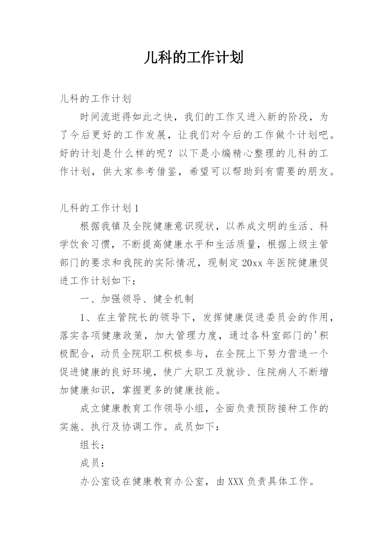 儿科的工作计划儿科的工作计划时间流逝得如此之快,我们的工作又进入新的阶段,为了今后更好的工作发展,让我们对今后的工作做个计划吧。好的计划是什么样的呢?以下是小编精心整理的儿科的工作计划,供大家参考借鉴,希望可以帮助到有需要的朋友。儿科的工作计划1根据我镇及全院健康意识现状,以养成文明的生活、科学饮食习惯,不断提高健康水平和生活质量,根据上级主管部门的要求和我院的实际情况,现制定20xx年医院健康促进工作计划如下:一、加强领导、健全机制1、在主管院长的领导下,发挥健康促进委员会的作用,落实各项健康政策,加大