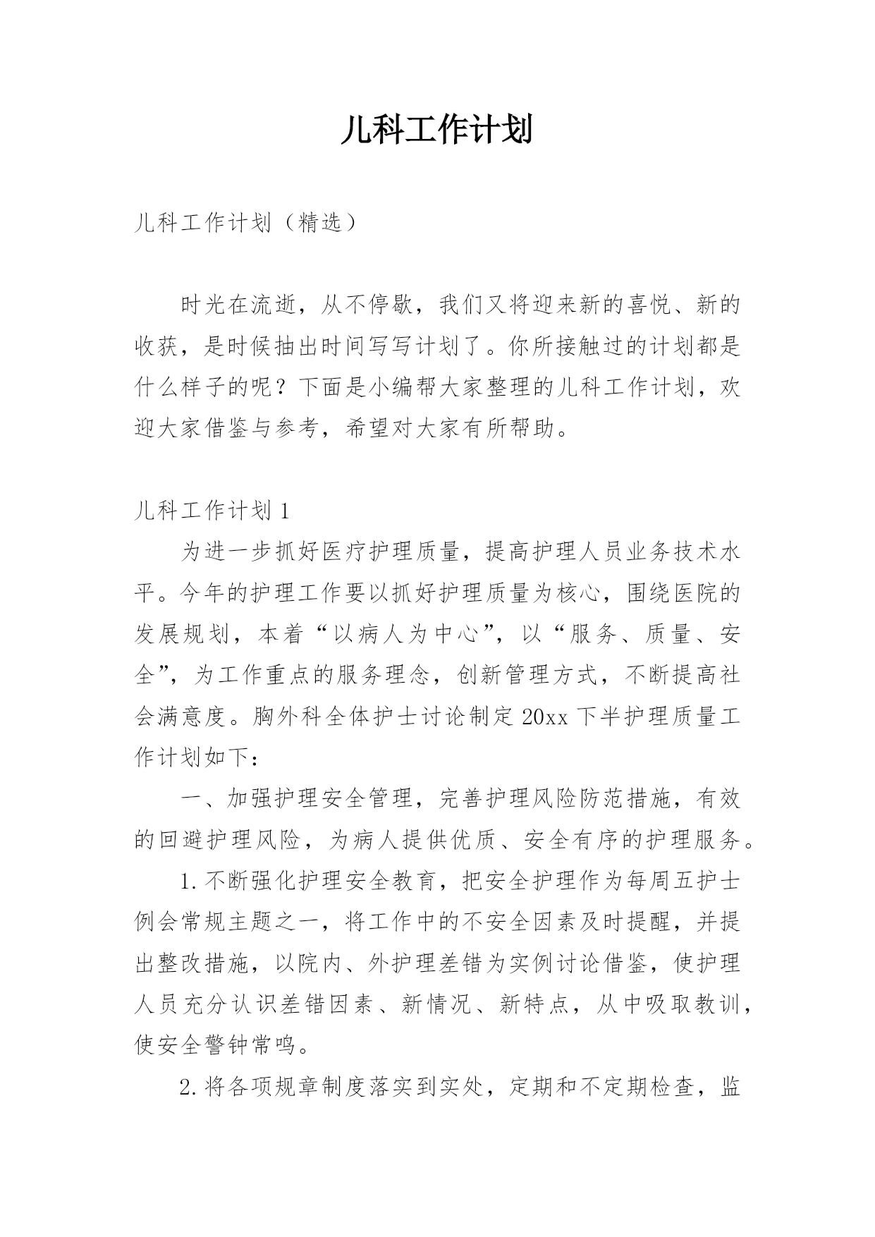 儿科工作计划儿科工作计划日子如同白驹过隙,不经意间,成绩已属于过去,新一轮的工作即将来临,做好计划,让自己成为更有竞争力的人吧。相信大家又在为写计划犯愁了吧?以下是小编精心整理的儿科工作计划,仅供参考,欢迎大家阅读。儿科工作计划120xx年,在医院各级领导关心支持下,儿科病房环境设施得到了很大改善,在新的一年里,随着科室条件的改善,对护理工作也提出了更高的要求,根据护理部20xx年护理工作计划结合本科室实际工作,特制订20xx年儿科护理工作计划如下:一、加强医德医风建设,提高病员满意度1、对住院病人发放满