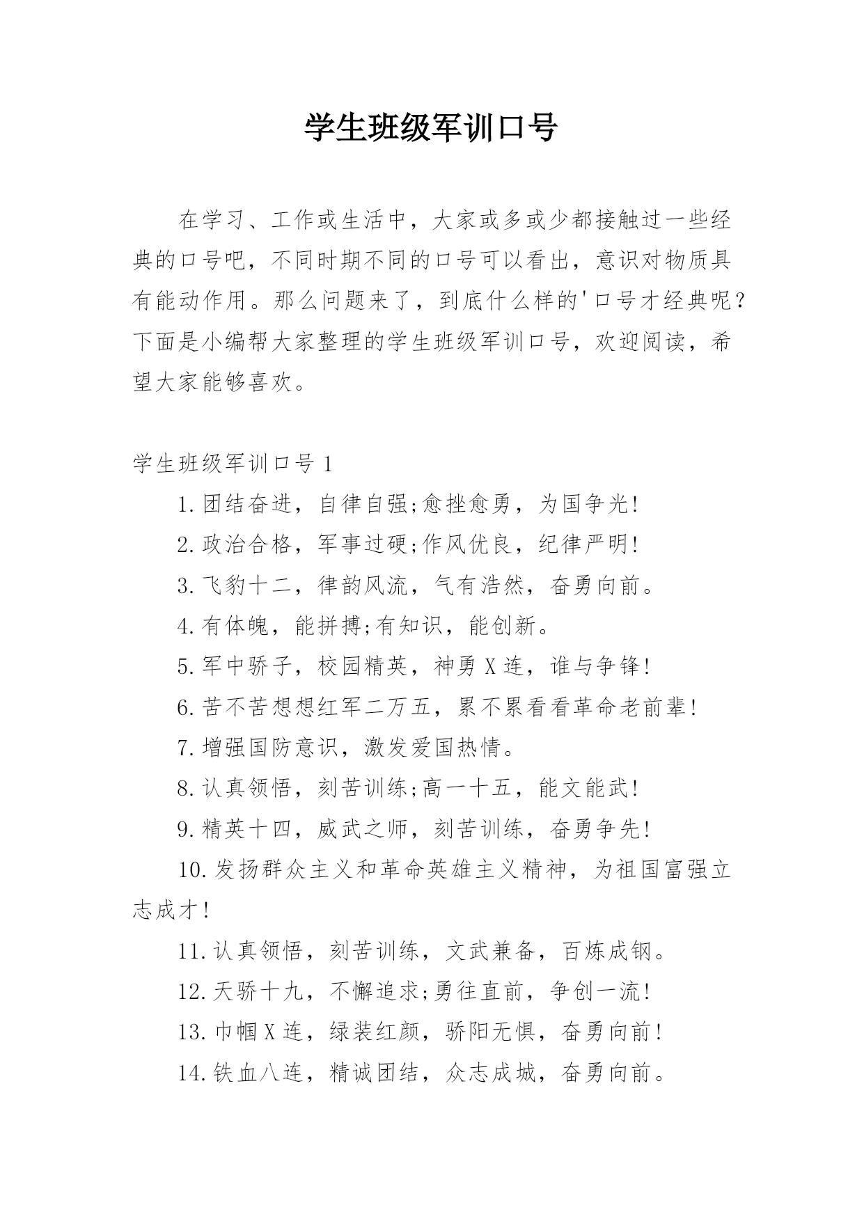 学生班级军训口号在学习、工作或生活中,大家或多或少都接触过一些经典的口号吧,不同时期不同的口号可以看出,意识对物质具有能动作用。那么问题来了,到底什么样的'口号才经典呢?下面是小编帮大家整理的学生班级军训口号,欢迎阅读,希望大家能够喜欢。学生班级军训口号11.团结奋进,自律自强;愈挫愈勇,为国争光!2.政治合格,军事过硬;作风优良,纪律严明!3.飞豹十二,律韵风流,气有浩然,奋勇向前。4.有体魄,能拼搏;有知识,能创新。5.军中骄子,校园精英,神勇X连,谁与争锋!6.苦不苦想想红军二万五,累不累看看革命老