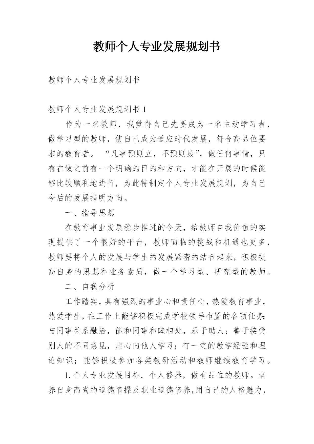 教师个人专业发展规划书教师个人专业发展规划书教师个人专业发展规划书1作为一名教师,我觉得自己先要成为一名主动学习者,做学习型的教师,使自己成为适应时代发展,符合高品位要求的教育者。“凡事预则立,不预则废”,做任何事情,只有在做之前有一个明确的目的和方向,才能在开展的时候能够比较顺利地进行,为此特制定个人专业发展规划,为自己今后的发展指明方向。一、指导思想在教育事业发展稳步推进的今天,给教师自我价值的实现提供了一个很好的平台,教师面临的挑战和机遇也更多,教师要将个人的发展与学生的发展紧密的结合起来,积极提高