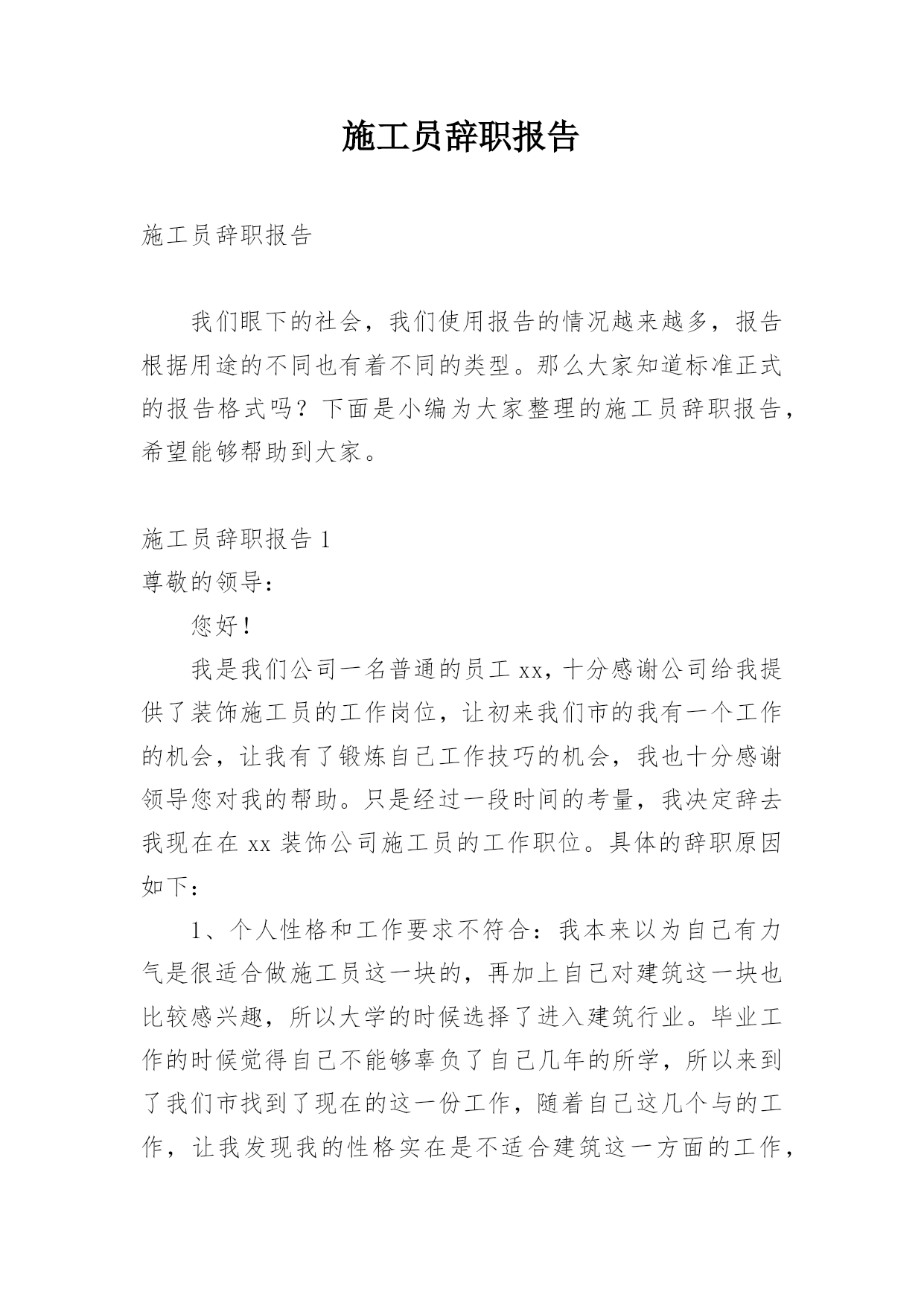 施工员辞职报告施工员辞职报告我们眼下的社会,我们使用报告的情况越来越多,报告根据用途的不同也有着不同的类型。那么大家知道标准正式的报告格式吗?下面是小编为大家整理的施工员辞职报告,希望能够帮助到大家。施工员辞职报告1尊敬的领导:您好!我是我们公司一名普通的员工xx,十分感谢公司给我提供了装饰施工员的工作岗位,让初来我们市的我有一个工作的机会,让我有了锻炼自己工作技巧的机会,我也十分感谢领导您对我的帮助。只是经过一段时间的考量,我决定辞去我现在在xx装饰公司施工员的工作职位。具体的辞职原因如下:1、个人性格