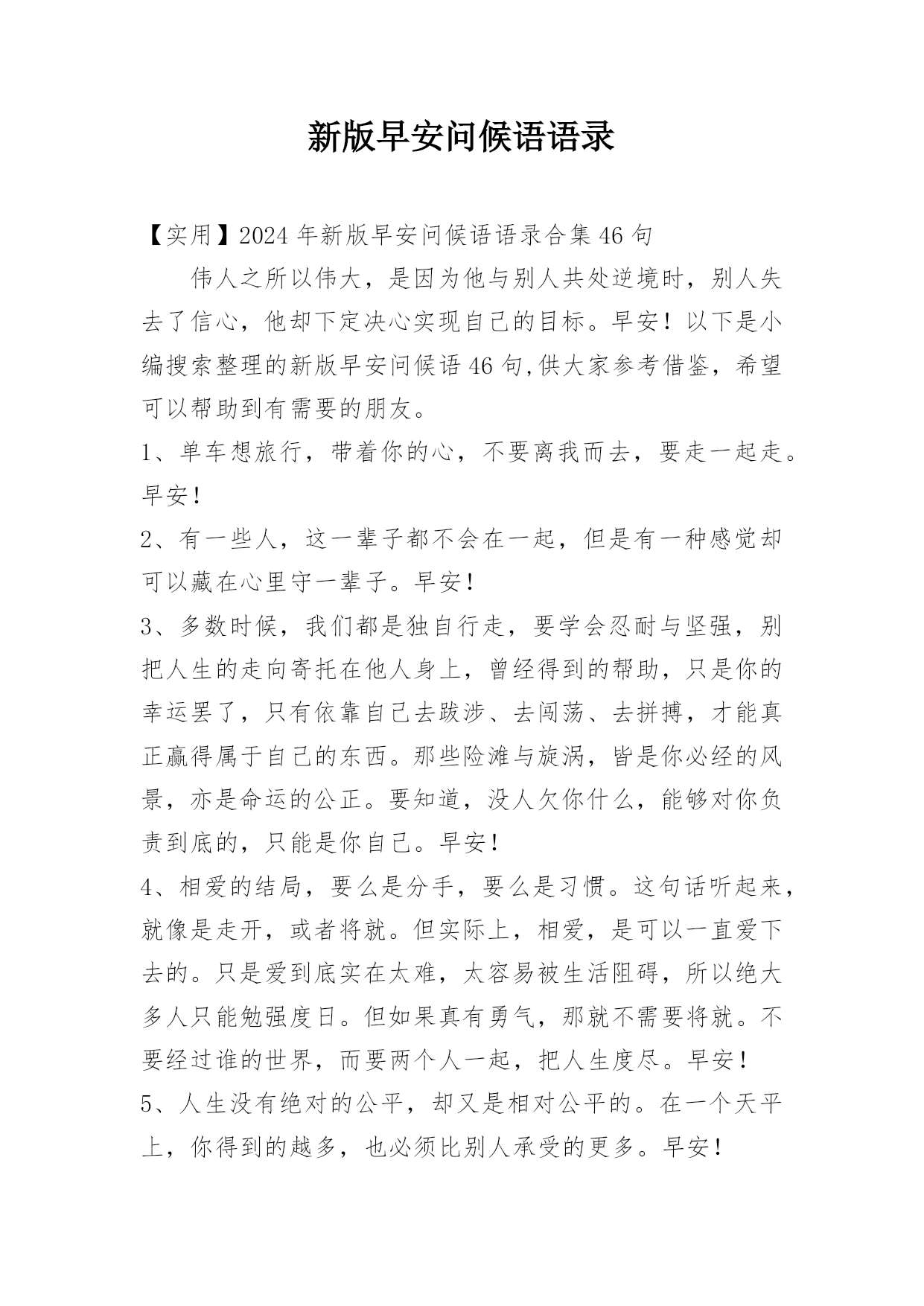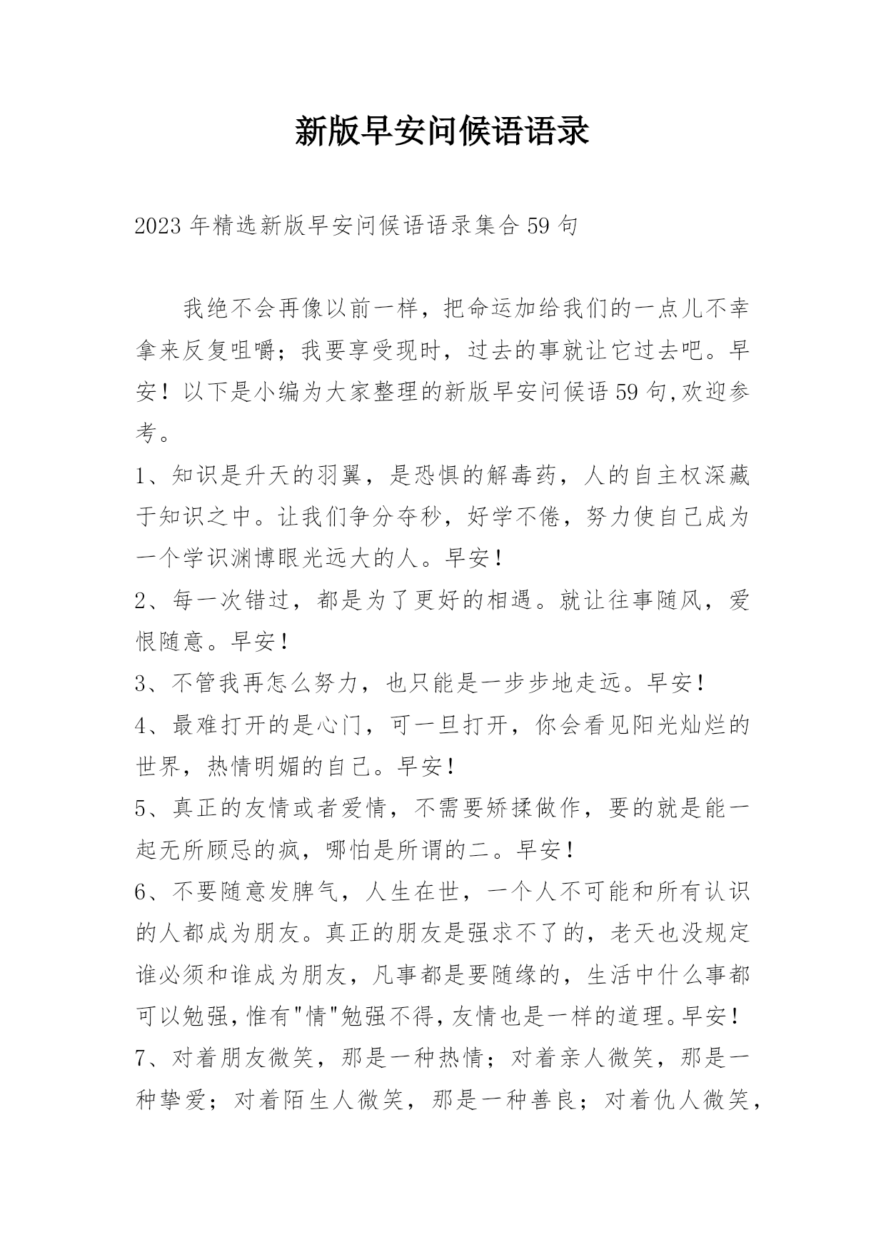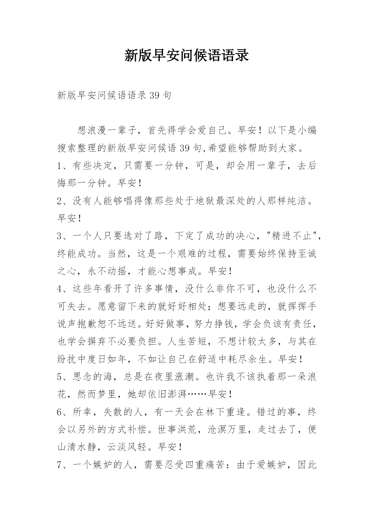 新版早安问候语语录新版早安问候语语录39句想浪漫一辈子,首先得学会爱自己。早安!以下是小编搜索整理的新版早安问候语39句,希望能够帮助到大家。1、有些决定,只需要一分钟,可是,却会用一辈子,去后悔那一分钟。早安!2、没有人能够唱得像那些处于地狱最深处的人那样纯洁。早安!3、一个人只要选对了路,下定了成功的决心,"精进不止",终能成功。当然,这是一个艰难的过程,需要始终保持至诚之心,永不动摇,才能心想事成。早安!4、这些年看开了许多事情,没什么非你不可,也没什么不可失去。愿意留下来的就好好相处;想要远走的,