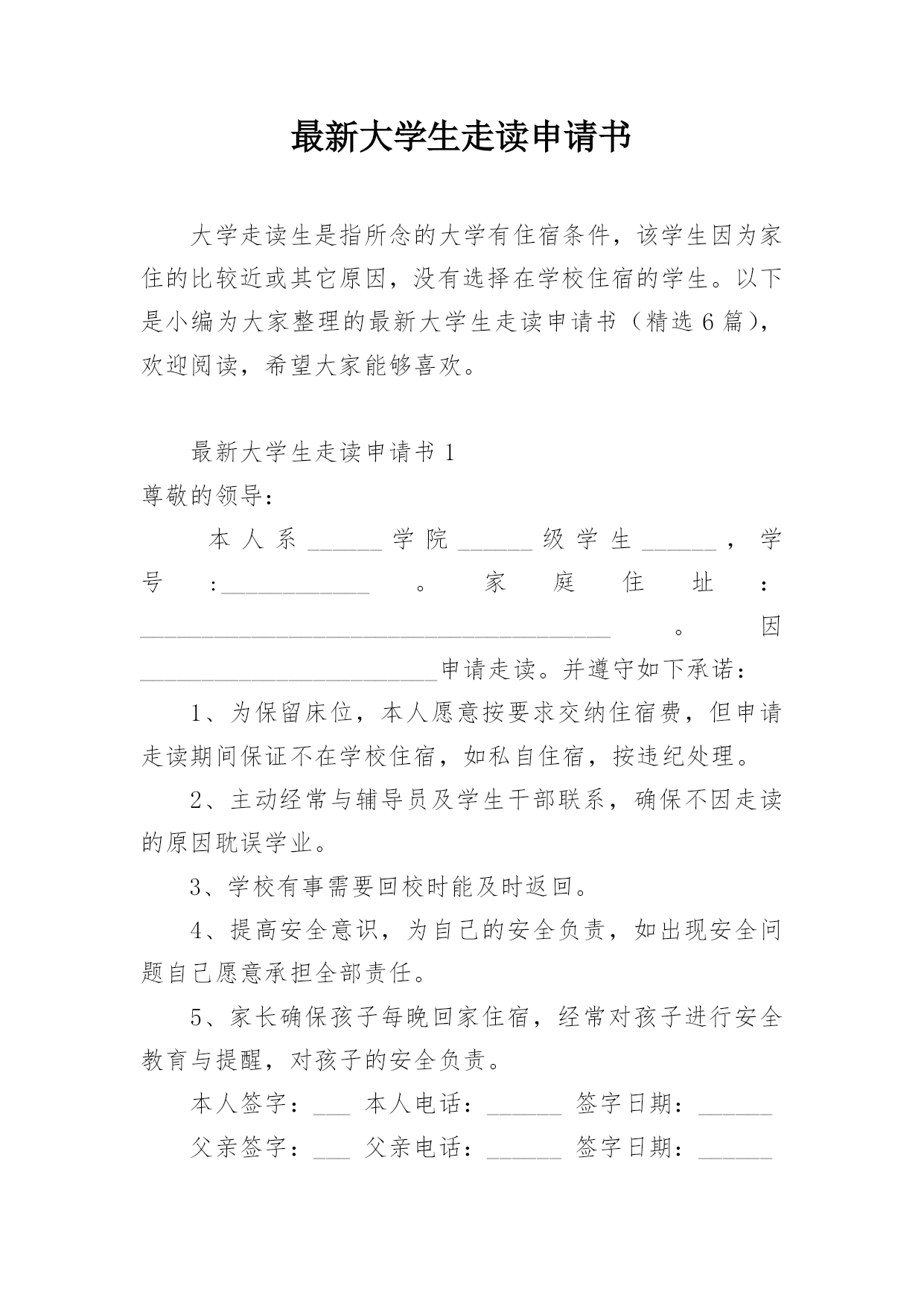 最新大学生走读申请书大学走读生是指所念的大学有住宿条件,该学生因为家住的比较近或其它原因,没有选择在学校住宿的学生。以下是小编为大家整理的最新大学生走读申请书(精选6篇),欢迎阅读,希望大家能够喜欢。最新大学生走读申请书1尊敬的领导:本人系______学院______级学生______,学号:____________。家庭住址:______________________________________。因________________________申请走读。并遵守如下承诺:1、为保留床位,本人愿意按