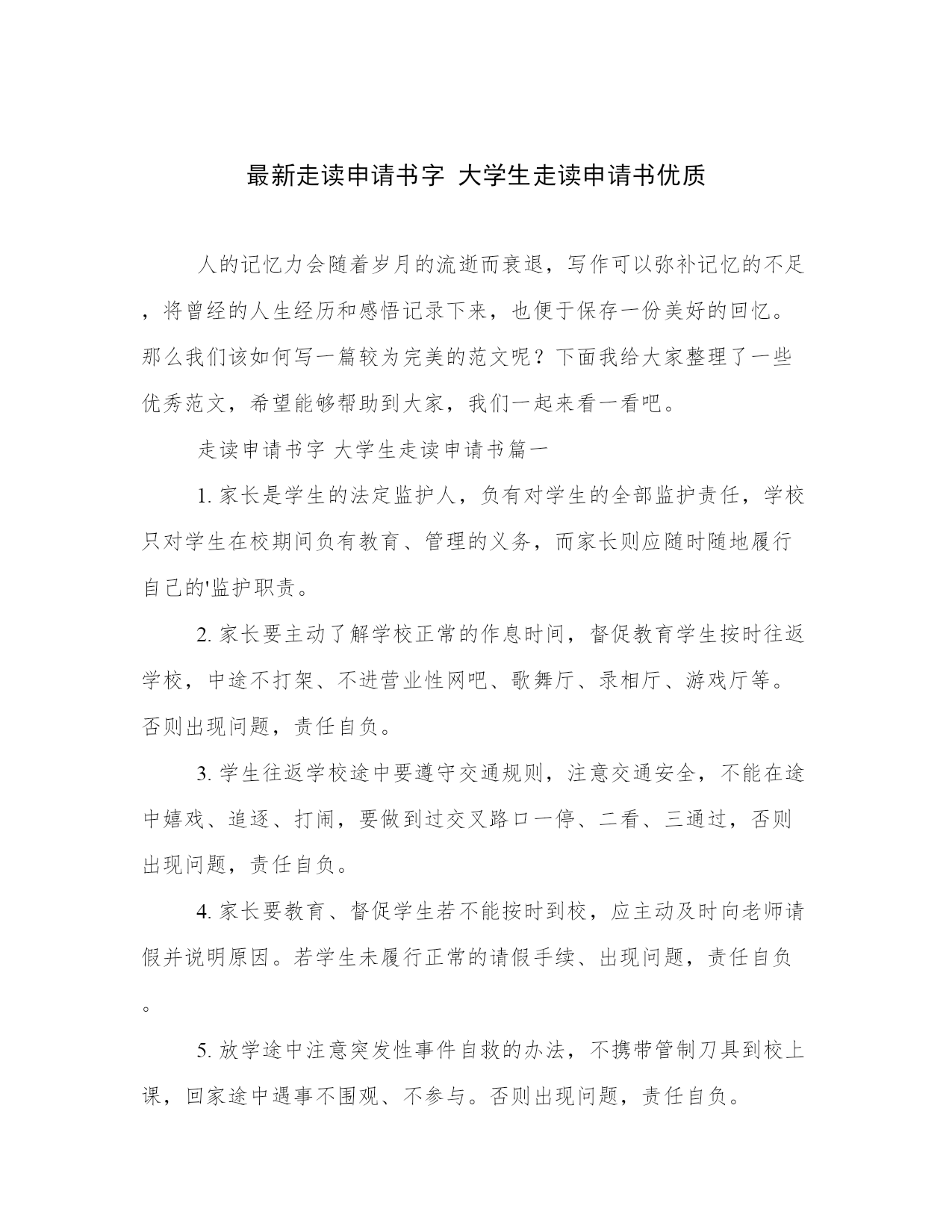 最新走读申请书字大学生走读申请书优质人的记忆力会随着岁月的流逝而衰退,写作可以弥补记忆的不足,将曾经的人生经历和感悟记录下来,也便于保存一份美好的回忆。那么我们该如何写一篇较为完美的范文呢?下面我给大家整理了一些优秀范文,希望能够帮助到大家,我们一起来看一看吧。走读申请书字大学生走读申请书篇一1.家长是学生的法定监护人,负有对学生的全部监护责任,学校只对学生在校期间负有教育、管理的义务,而家长则应随时随地履行自己的'监护职责。2.家长要主动了解学校正常的作息时间,督促教育学生按时往返学校,中途不打架、不进