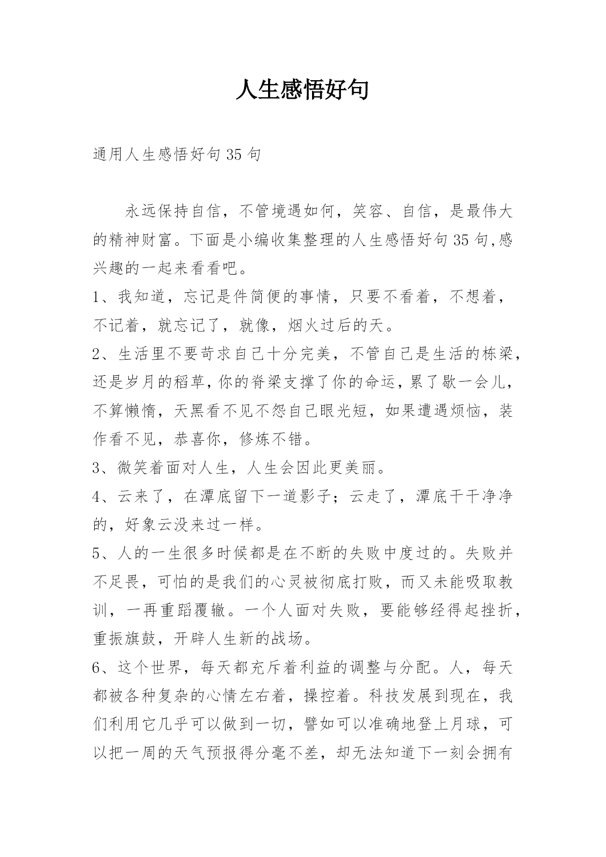 人生感悟好句通用人生感悟好句35句永远保持自信,不管境遇如何,笑容、自信,是最伟大的精神财富。下面是小编收集整理的人生感悟好句35句,感兴趣的一起来看看吧。1、我知道,忘记是件简便的事情,只要不看着,不想着,不记着,就忘记了,就像,烟火过后的天。2、生活里不要苛求自己十分完美,不管自己是生活的栋梁,还是岁月的稻草,你的脊梁支撑了你的命运,累了歇一会儿,不算懒惰,天黑看不见不怨自己眼光短,如果遭遇烦恼,装作看不见,恭喜你,修炼不错。3、微笑着面对人生,人生会因此更美丽。4、云来了,在潭底留下一道影子;云走了