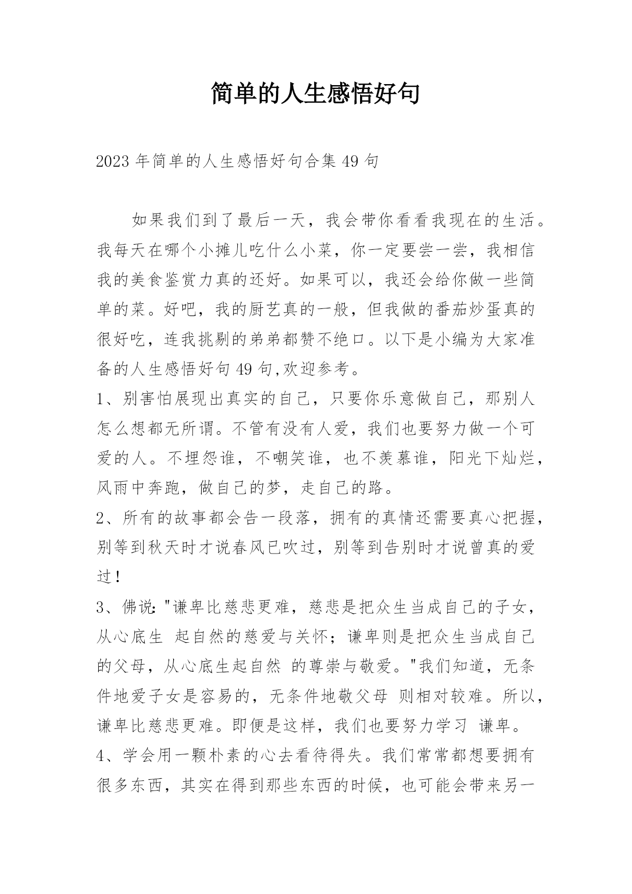 简单的人生感悟好句2023年简单的人生感悟好句合集49句如果我们到了最后一天,我会带你看看我现在的生活。我每天在哪个小摊儿吃什么小菜,你一定要尝一尝,我相信我的美食鉴赏力真的还好。如果可以,我还会给你做一些简单的菜。好吧,我的厨艺真的一般,但我做的番茄炒蛋真的很好吃,连我挑剔的弟弟都赞不绝口。以下是小编为大家准备的人生感悟好句49句,欢迎参考。1、别害怕展现出真实的自己,只要你乐意做自己,那别人怎么想都无所谓。不管有没有人爱,我们也要努力做一个可爱的人。不埋怨谁,不嘲笑谁,也不羡慕谁,阳光下灿烂,风雨中奔