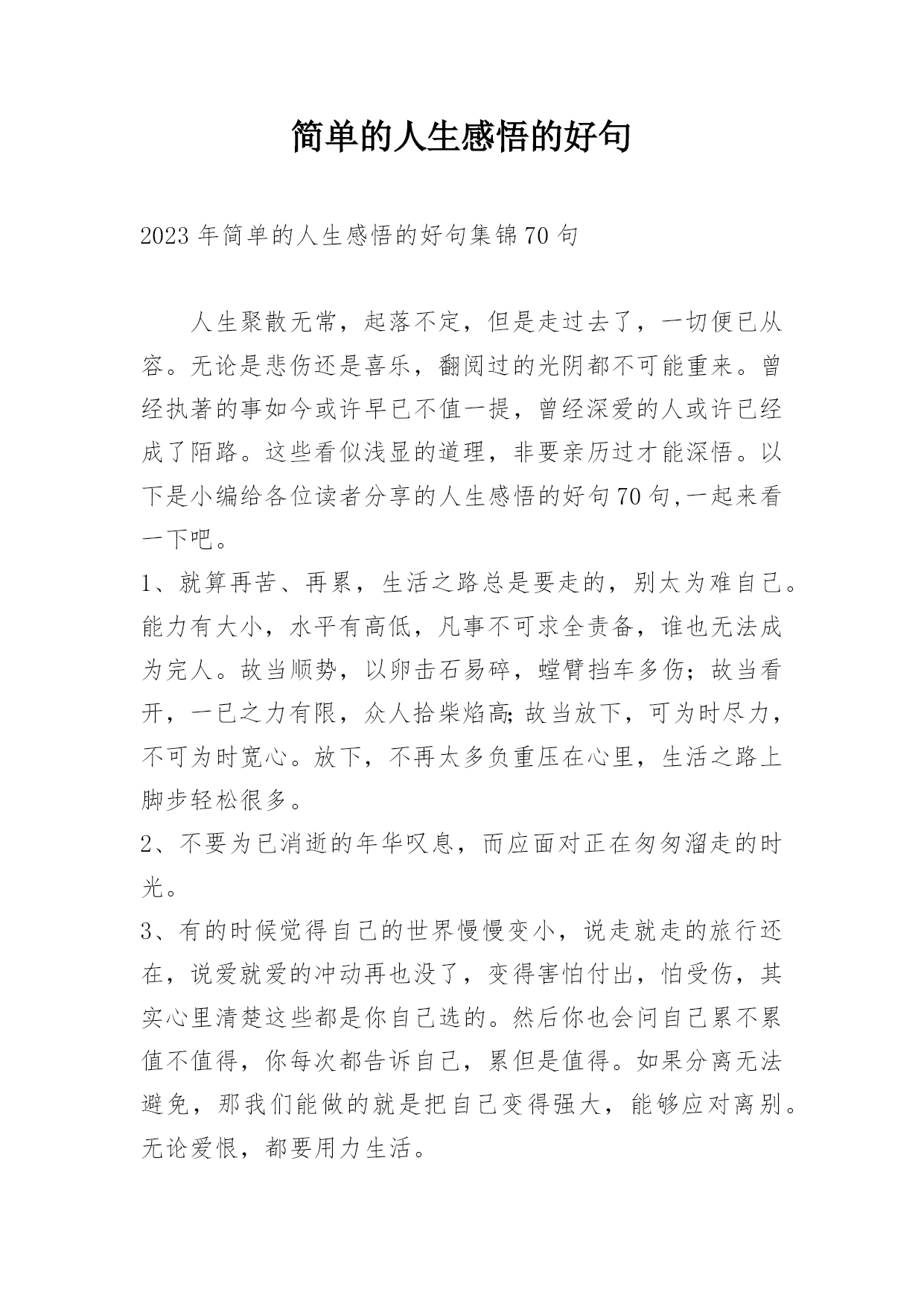 简单的人生感悟的好句2023年简单的人生感悟的好句集锦70句人生聚散无常,起落不定,但是走过去了,一切便已从容。无论是悲伤还是喜乐,翻阅过的光阴都不可能重来。曾经执著的事如今或许早已不值一提,曾经深爱的人或许已经成了陌路。这些看似浅显的道理,非要亲历过才能深悟。以下是小编给各位读者分享的人生感悟的好句70句,一起来看一下吧。1、就算再苦、再累,生活之路总是要走的,别太为难自己。能力有大小,水平有高低,凡事不可求全责备,谁也无法成为完人。故当顺势,以卵击石易碎,螳臂挡车多伤;故当看开,一已之力有限,众人拾柴