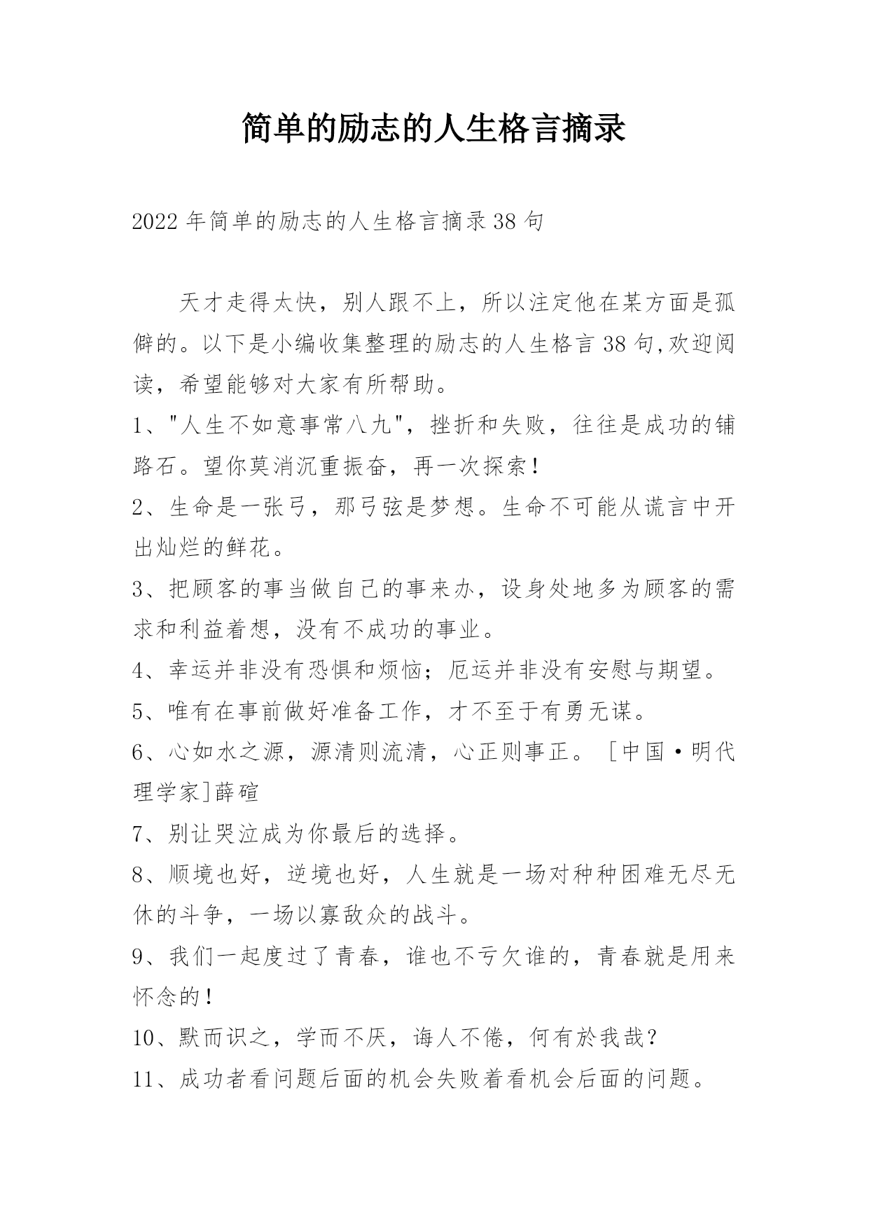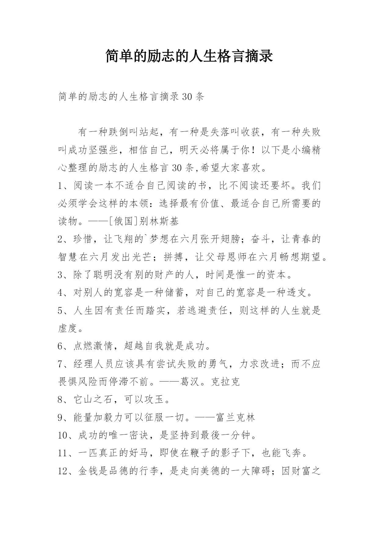 简单的励志的人生格言摘录简单的励志的人生格言摘录30条有一种跌倒叫站起,有一种是失落叫收获,有一种失败叫成功坚强些,相信自己,明天必将属于你!以下是小编精心整理的励志的人生格言30条,希望大家喜欢。1、阅读一本不适合自己阅读的书,比不阅读还要坏。我们必须学会这样的本领:选择最有价值、最适合自己所需要的读物。——[俄国]别林斯基2、珍惜,让飞翔的`梦想在六月张开翅膀;奋斗,让青春的智慧在六月发出光芒;拼搏,让父母恩师在六月畅想期望。3、除了聪明没有别的财产的人,时间是惟一的资本。4、对别人的宽容是一种储蓄,