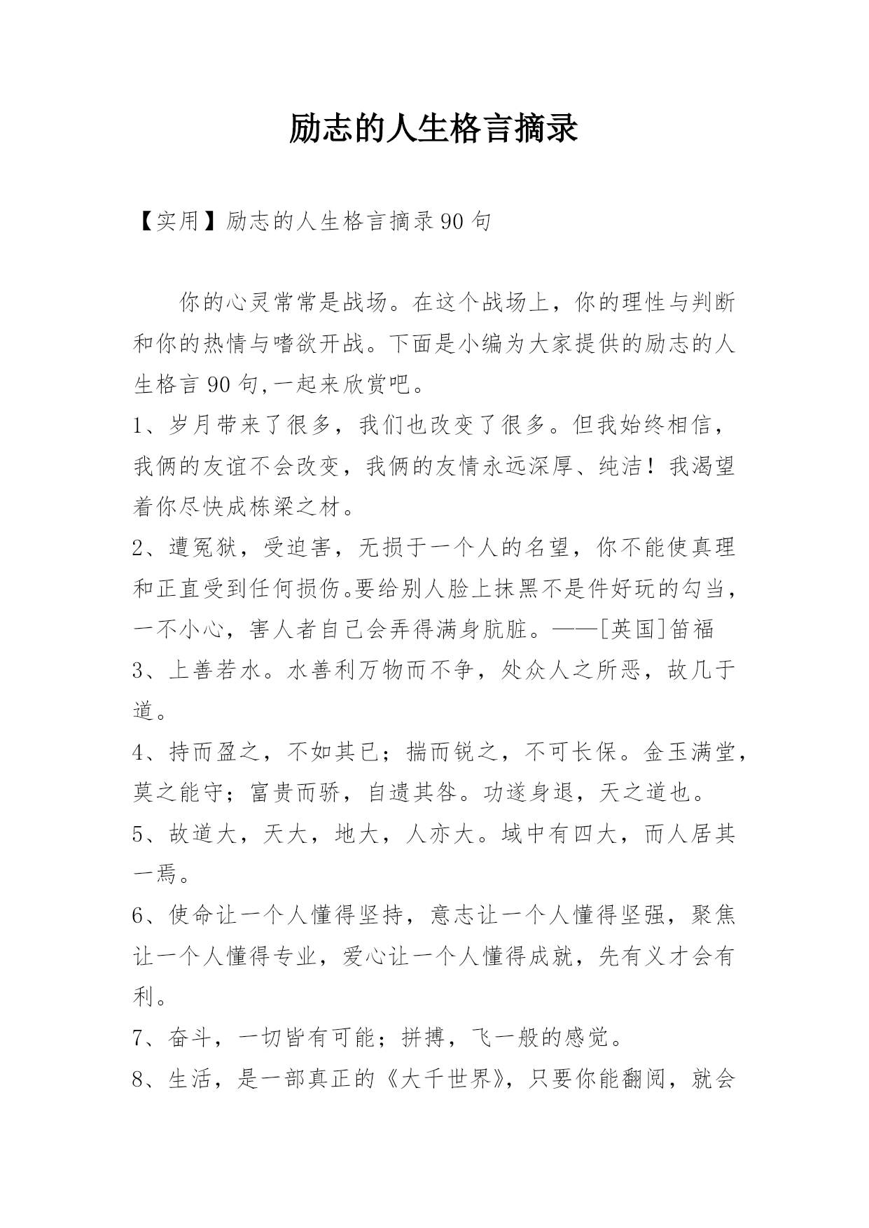励志的人生格言摘录【实用】励志的人生格言摘录90句你的心灵常常是战场。在这个战场上,你的理性与判断和你的热情与嗜欲开战。下面是小编为大家提供的励志的人生格言90句,一起来欣赏吧。1、岁月带来了很多,我们也改变了很多。但我始终相信,我俩的友谊不会改变,我俩的友情永远深厚、纯洁!我渴望着你尽快成栋梁之材。2、遭冤狱,受迫害,无损于一个人的名望,你不能使真理和正直受到任何损伤。要给别人脸上抹黑不是件好玩的勾当,一不小心,害人者自己会弄得满身肮脏。——[英国]笛福3、上善若水。水善利万物而不争,处众人之所恶,故几