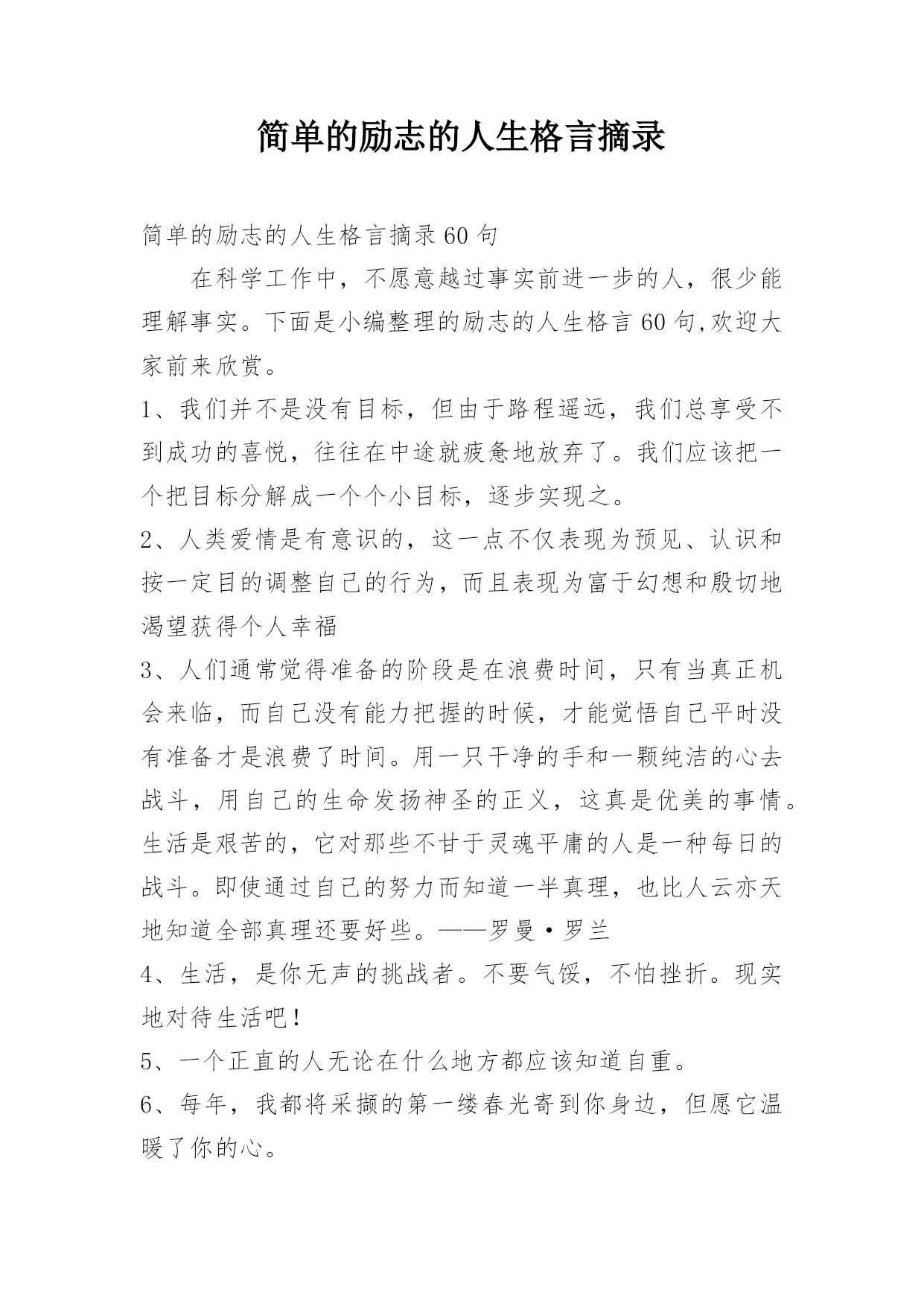 简单的励志的人生格言摘录简单的励志的人生格言摘录65句失意事来,治之以忍,方不为失意所苦。快心事来,处之以淡,方不为快心所惑。下面是小编为大家整理的励志的人生格言65句,欢迎阅读,希望大家能够喜欢。1、碰到坏消息,应该努力传达让高层了解。——安迪·葛洛夫2、上德不德,是以有德;下德不失德,是以无德。上德无为而无以为;下德无为而有以为。上仁为之而无以为;上义为之而有以为。上礼为之而莫之应,则攘臂而扔之。故失道而后德,失德而后仁,失仁而后义,失义而后礼。3、祸莫大于不知足;咎莫大于欲得。故知足之足,常足矣。4