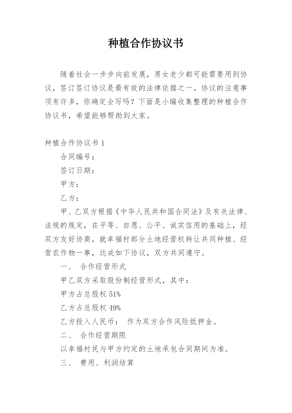 种植合作协议书随着社会一步步向前发展,男女老少都可能需要用到协议,签订签订协议是最有效的法律依据之一。协议的注意事项有许多,你确定会写吗?下面是小编收集整理的种植合作协议书,希望能够帮助到大家。种植合作协议书1合同编号:签订日期:甲方:乙方:甲、乙双方根据《中华人民共和国合同法》及有关法律、法规的规定,在平等、自愿、公平、诚实信用的基础上,经双方友好协商,就幸福村部分土地经营权转让共同种植、经营农作物一事,达成如下协议,双方共同遵守。一、合作经营形式甲乙双方采取股份制经营形式,其中:甲方占总股权51%乙方
