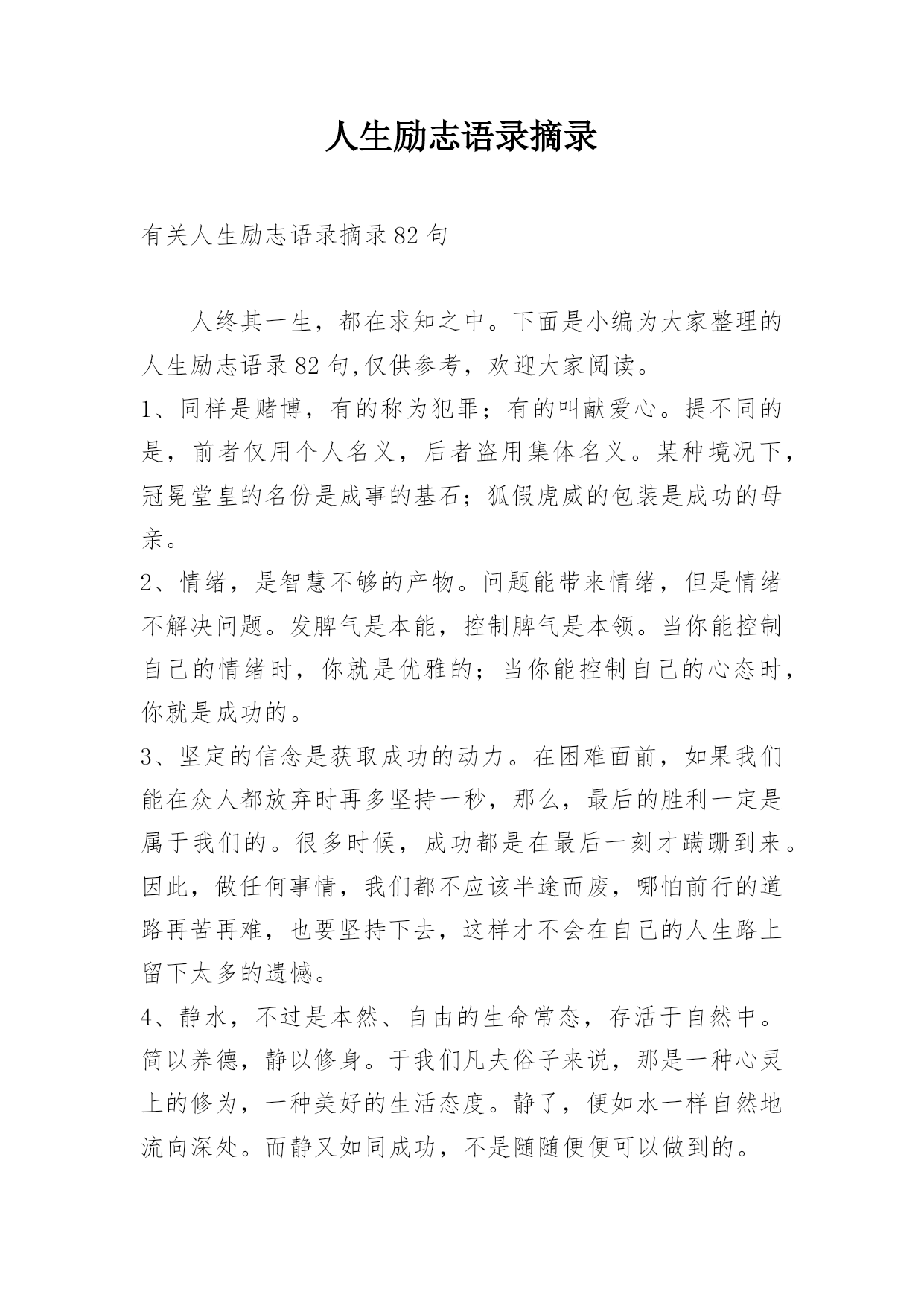 人生励志语录摘录有关人生励志语录摘录82句人终其一生,都在求知之中。下面是小编为大家整理的人生励志语录82句,仅供参考,欢迎大家阅读。1、同样是赌博,有的称为犯罪;有的叫献爱心。提不同的是,前者仅用个人名义,后者盗用集体名义。某种境况下,冠冕堂皇的名份是成事的基石;狐假虎威的包装是成功的母亲。2、情绪,是智慧不够的产物。问题能带来情绪,但是情绪不解决问题。发脾气是本能,控制脾气是本领。当你能控制自己的情绪时,你就是优雅的;当你能控制自己的心态时,你就是成功的。3、坚定的信念是获取成功的动力。在困难面前,如