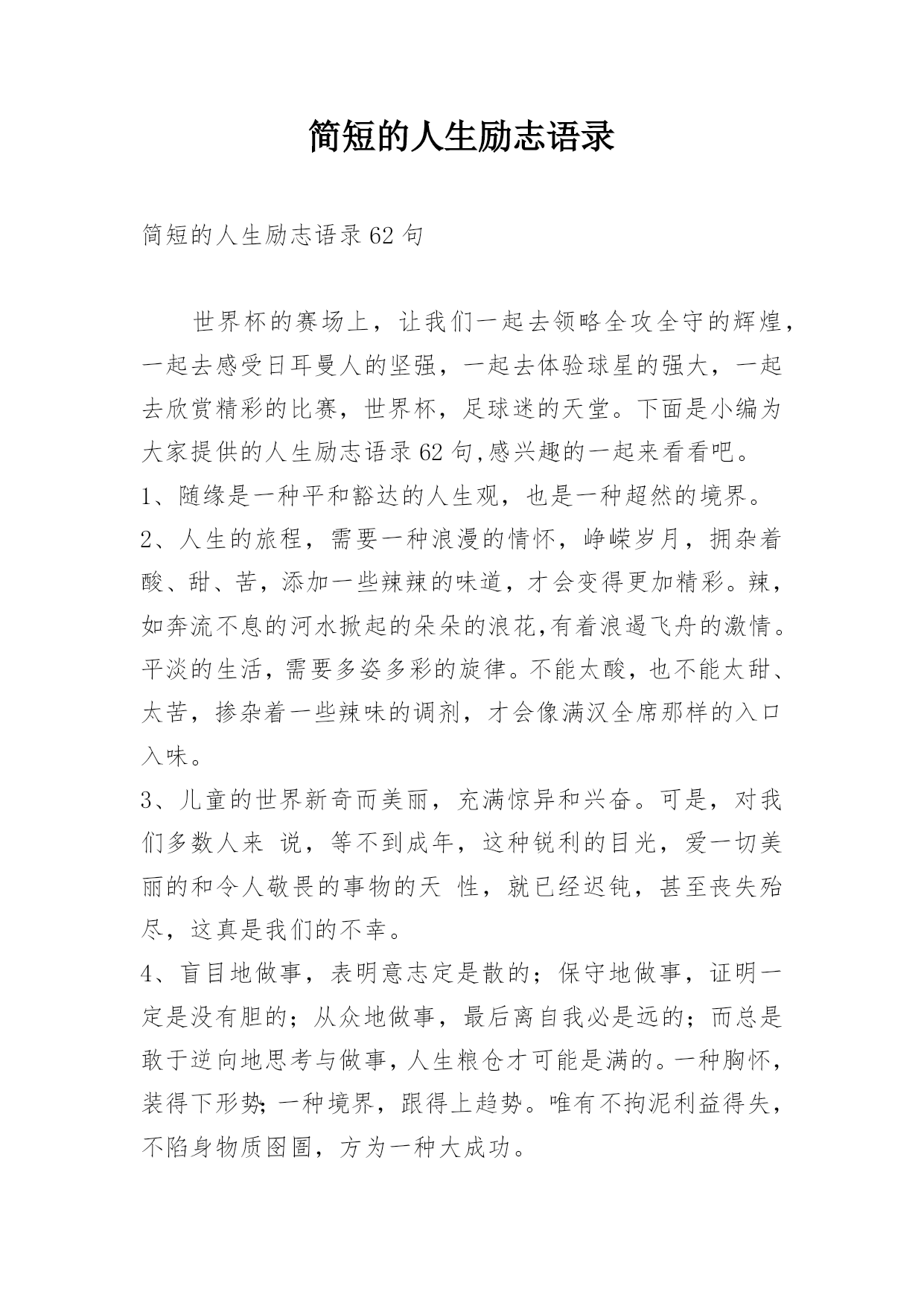 简短的人生励志语录简短的人生励志语录62句世界杯的赛场上,让我们一起去领略全攻全守的辉煌,一起去感受日耳曼人的坚强,一起去体验球星的强大,一起去欣赏精彩的比赛,世界杯,足球迷的天堂。下面是小编为大家提供的人生励志语录62句,感兴趣的一起来看看吧。1、随缘是一种平和豁达的人生观,也是一种超然的境界。2、人生的旅程,需要一种浪漫的情怀,峥嵘岁月,拥杂着酸、甜、苦,添加一些辣辣的味道,才会变得更加精彩。辣,如奔流不息的河水掀起的朵朵的浪花,有着浪遏飞舟的激情。平淡的生活,需要多姿多彩的旋律。不能太酸,也不能太甜