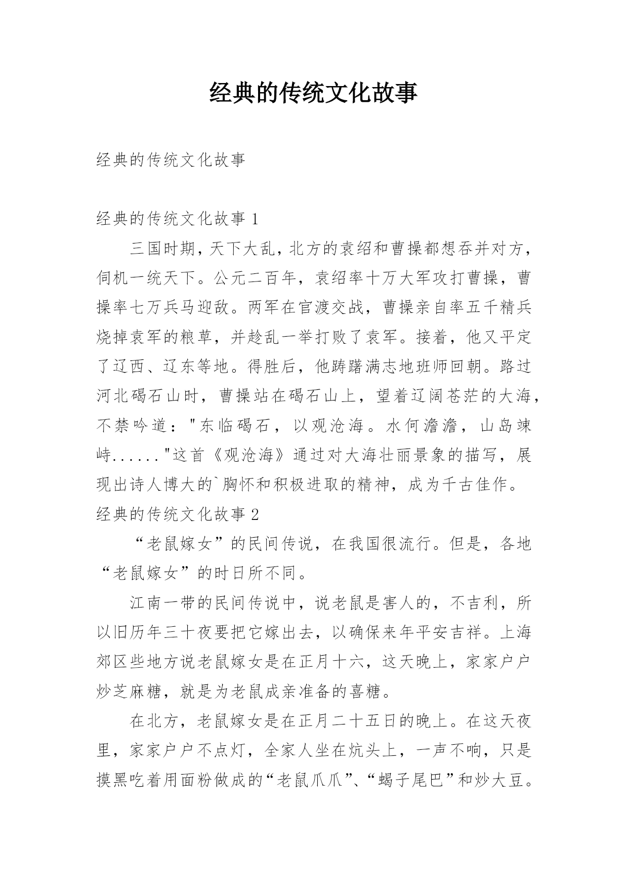 经典的传统文化故事经典的传统文化故事经典的传统文化故事1三国时期,天下大乱,北方的袁绍和曹操都想吞并对方,伺机一统天下。公元二百年,袁绍率十万大军攻打曹操,曹操率七万兵马迎敌。两军在官渡交战,曹操亲自率五千精兵烧掉袁军的粮草,并趁乱一举打败了袁军。接着,他又平定了辽西、辽东等地。得胜后,他踌躇满志地班师回朝。路过河北碣石山时,曹操站在碣石山上,望着辽阔苍茫的大海,不禁吟道:"东临碣石,以观沧海。水何澹澹,山岛竦峙......"这首《观沧海》通过对大海壮丽景象的描写,展现出诗人博大的`胸怀和积极进取的精神,
