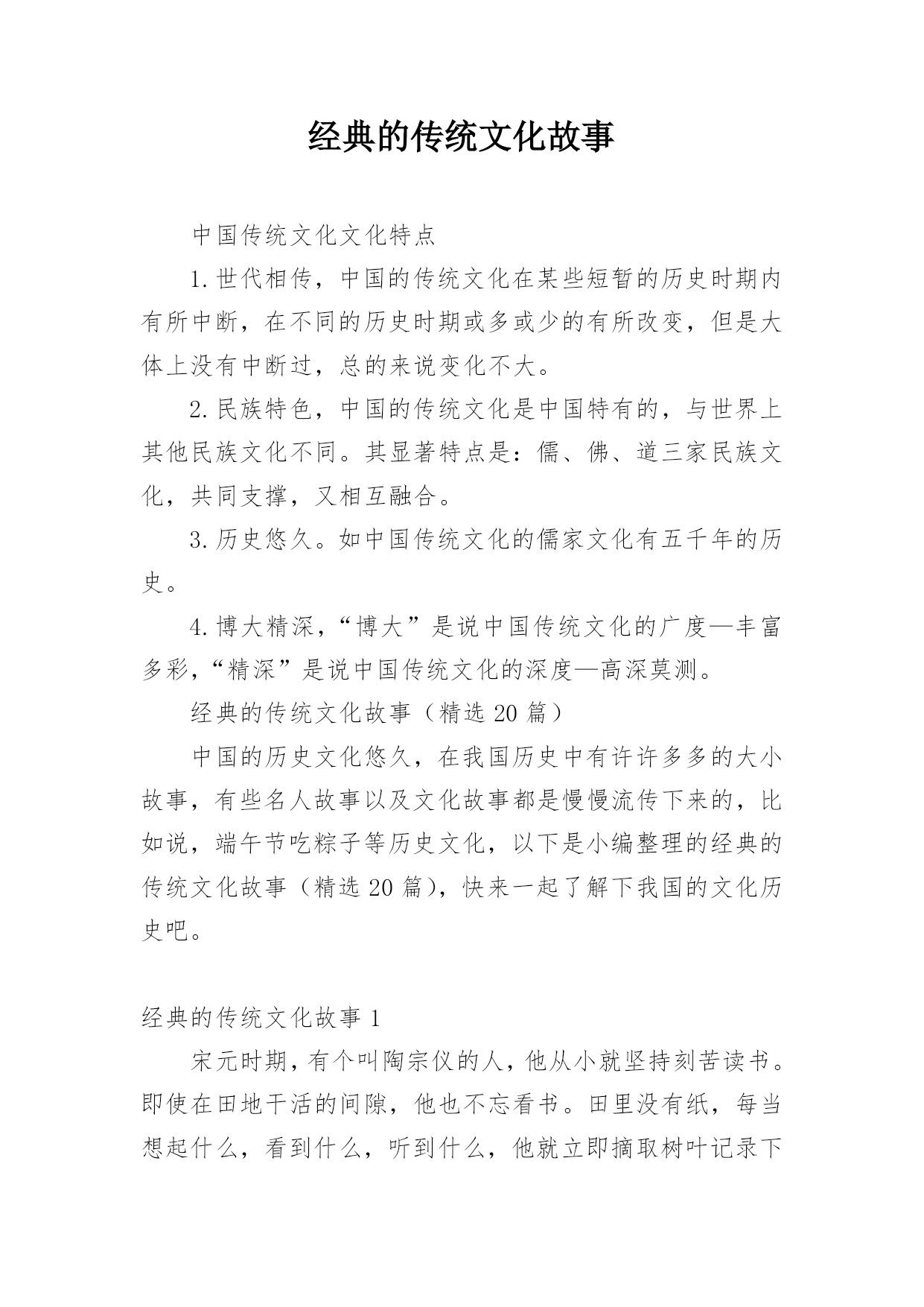 经典的传统文化故事经典的传统文化故事中国传统文化文化特点1.世代相传,中国的传统文化在某些短暂的历史时期内有所中断,在不同的历史时期或多或少的有所改变,但是大体上没有中断过,总的来说变化不大。2.民族特色,中国的传统文化是中国特有的,与世界上其他民族文化不同。其显著特点是:儒、佛、道三家民族文化,共同支撑,又相互融合。3.历史悠久。如中国传统文化的儒家文化有五千年的历史。4.博大精深,“博大”是说中国传统文化的广度—丰富多彩,“精深”是说中国传统文化的深度—高深莫测。经典的传统文化故事(精选20篇)中国的