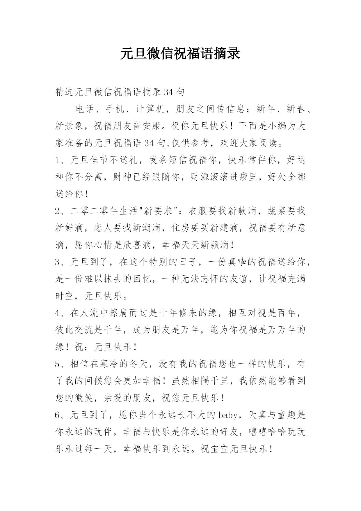 元旦微信祝福语摘录精选元旦微信祝福语摘录34句电话、手机、计算机,朋友之间传信息;新年、新春、新景象,祝福朋友皆安康。祝你元旦快乐!下面是小编为大家准备的元旦祝福语34句,仅供参考,欢迎大家阅读。1、元旦佳节不送礼,发条短信祝福你,快乐常伴你,好运和你不分离,财神已经跟随你,财源滚滚进袋里,好处全都送给你!2、二零二零年生活"新要求":衣服要找新款滴,蔬菜要找新鲜滴,恋人要找新潮滴,住房要买新建滴,祝福要有新意滴,愿你心情是欣喜滴,幸福天天新颖滴!3、元旦到了,在这个特别的日子,一份真挚的祝福送给你,是一