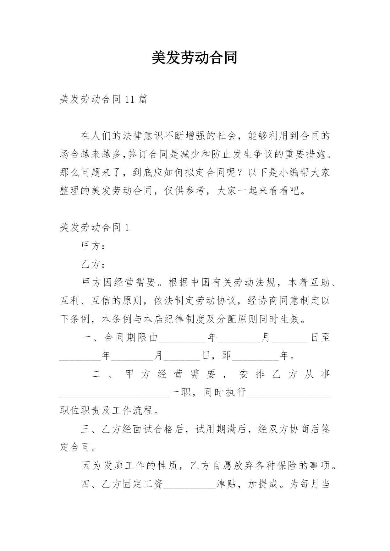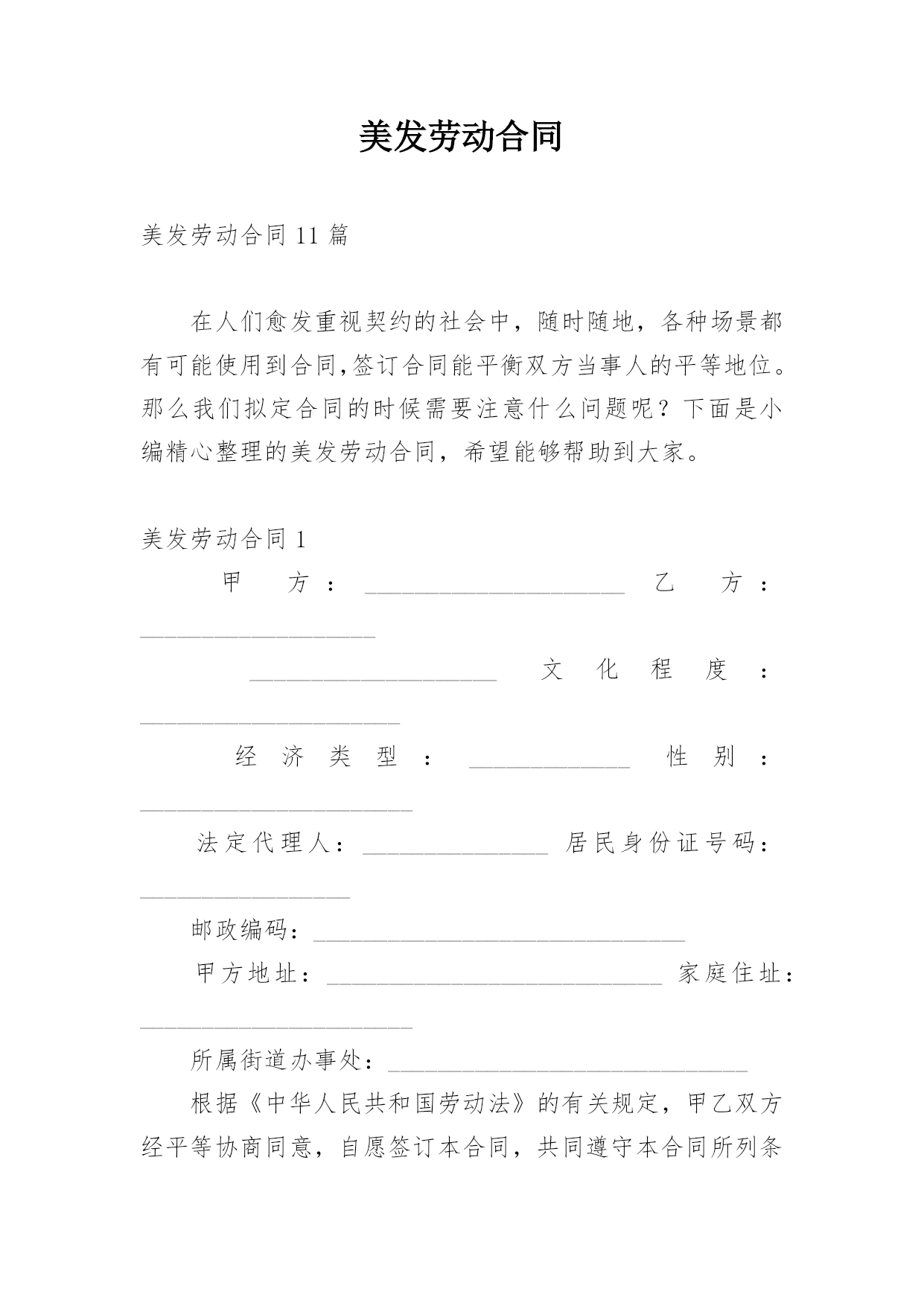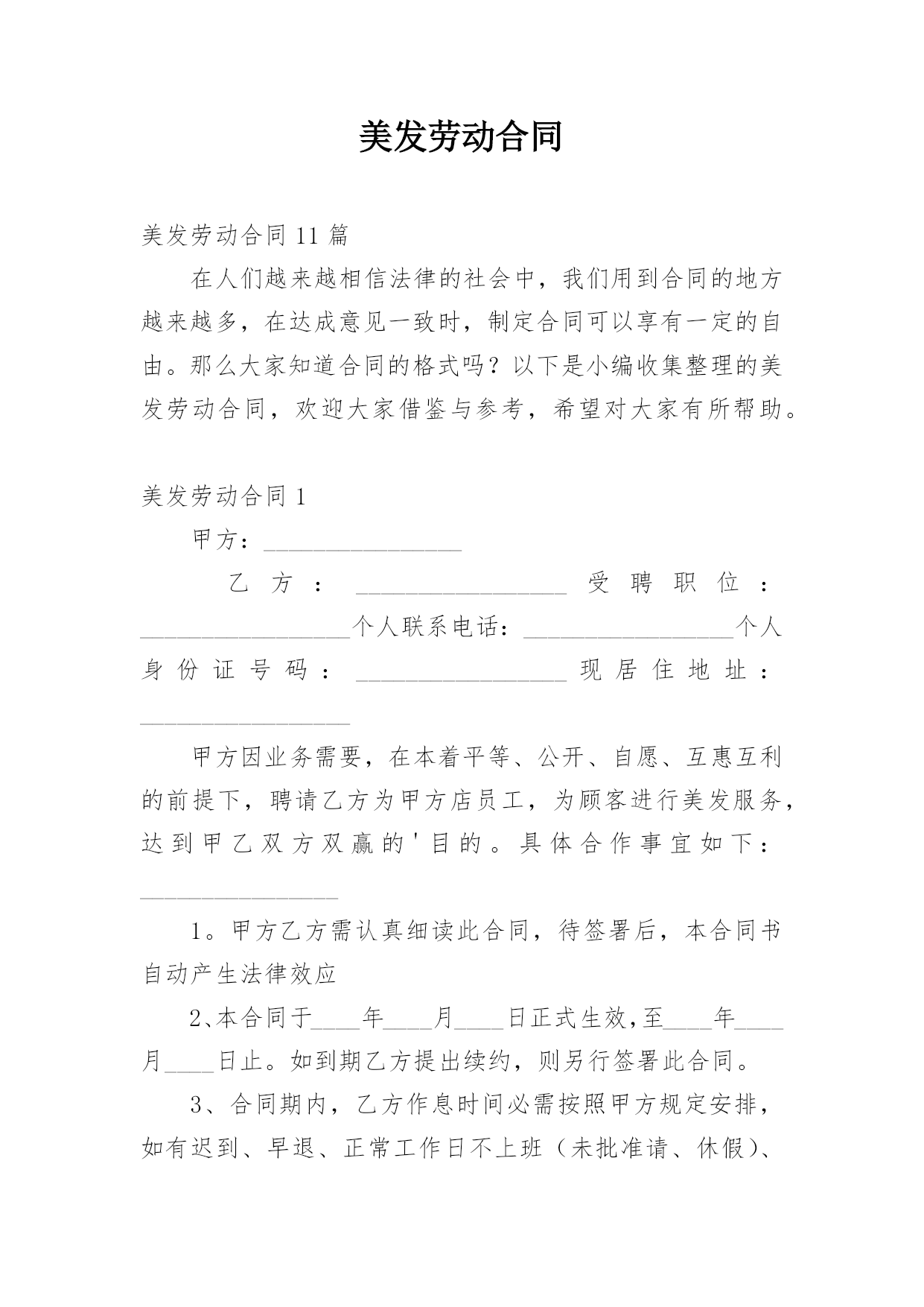 美发劳动合同美发劳动合同11篇在人们越来越相信法律的社会中,我们用到合同的地方越来越多,在达成意见一致时,制定合同可以享有一定的自由。那么大家知道合同的格式吗?以下是小编收集整理的美发劳动合同,欢迎大家借鉴与参考,希望对大家有所帮助。美发劳动合同1甲方:________________乙方:_________________受聘职位:_________________个人联系电话:_________________个人身份证号码:_________________现居住地址:_______________