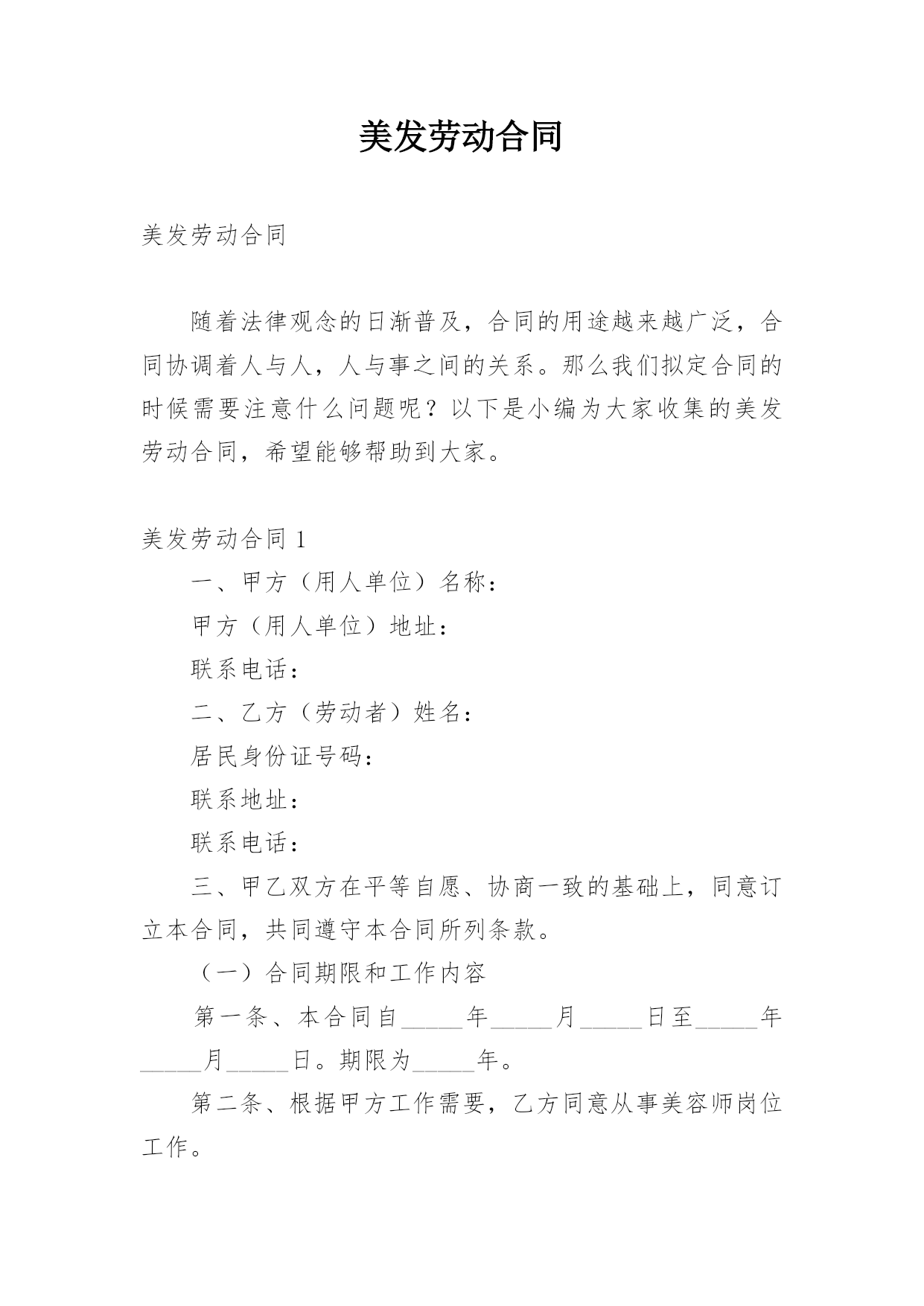美发劳动合同美发劳动合同随着法律观念的日渐普及,合同的用途越来越广泛,合同协调着人与人,人与事之间的关系。那么我们拟定合同的时候需要注意什么问题呢?以下是小编为大家收集的美发劳动合同,希望能够帮助到大家。美发劳动合同1一、甲方(用人单位)名称:甲方(用人单位)地址:联系电话:二、乙方(劳动者)姓名:居民身份证号码:联系地址:联系电话:三、甲乙双方在平等自愿、协商一致的基础上,同意订立本合同,共同遵守本合同所列条款。(一)合同期限和工作内容第一条、本合同自_____年_____月_____日至_____年_