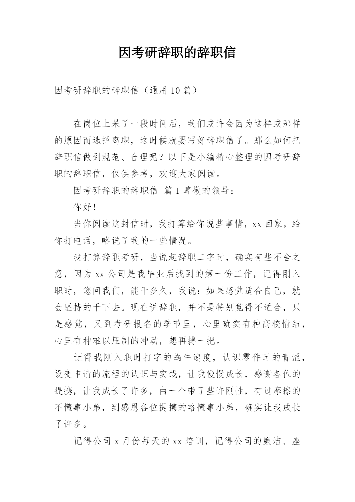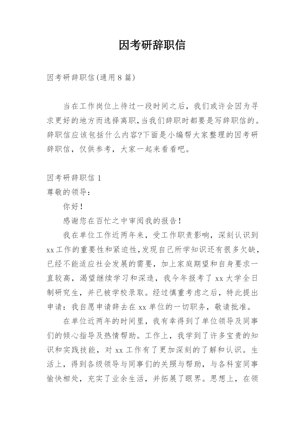 因考研辞职信因考研辞职信(精选9篇)现今,辞职越来越常见了,我们或许会因为这样或那样的原因而选择离职,这时就要认真思考写辞职信的事情了。那么你真的会写辞职信吗?以下是小编为大家整理的因考研辞职信,希望对大家有所帮助。因考研辞职信1尊敬的领导:您好我是20xx年新入司的xxxx,我非常高兴能在一毕业就加入了xxxx有限公司这个大家庭,并且认识了众多的前辈和朋友,在工作和生活上也得到了极大的帮助,使我受益匪浅。随着在工作中的学习和锻炼,使我深刻认识到内心对更深一步知识的渴望以及对自身理想的重新审视,从而我决定