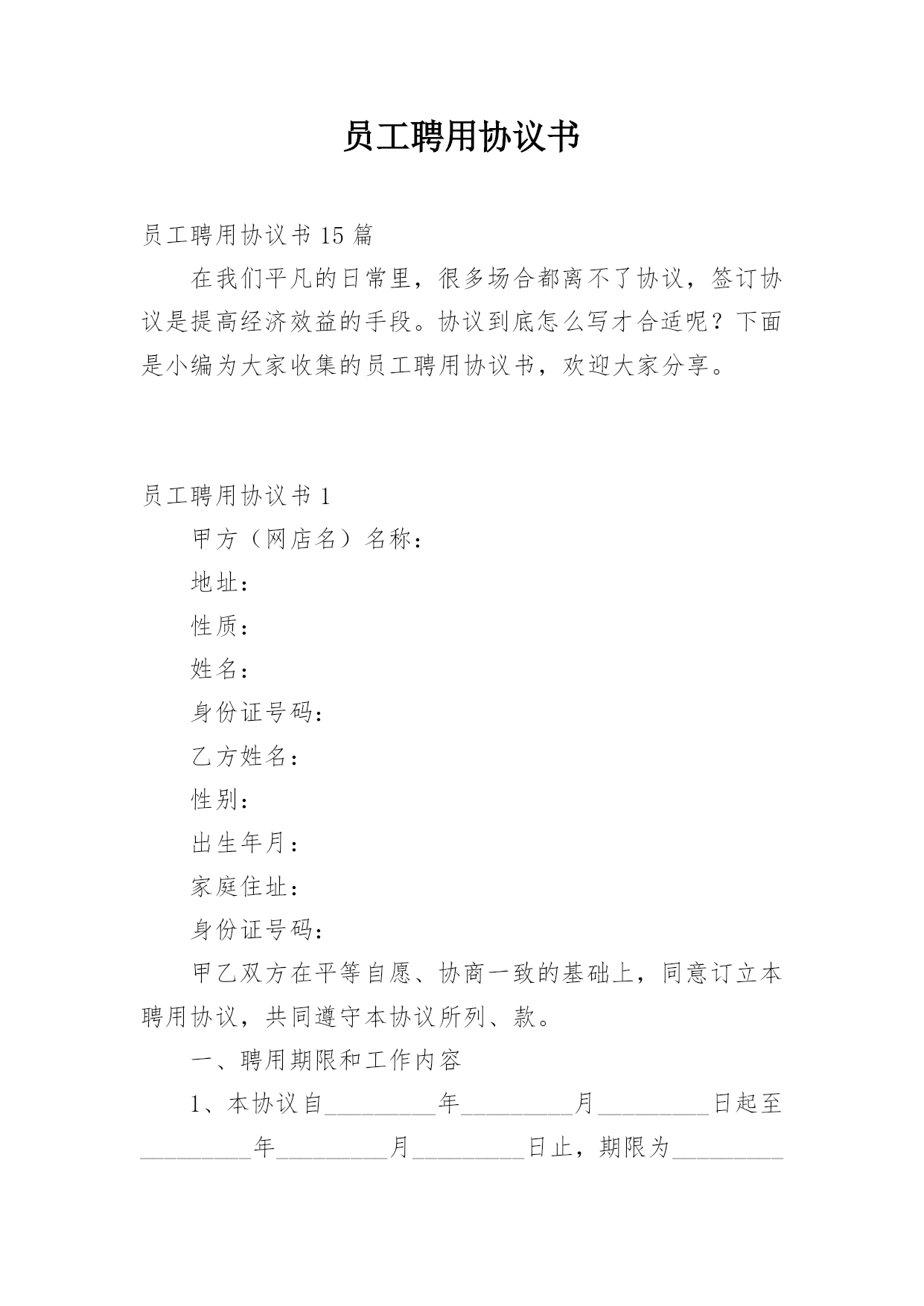 员工聘用协议书员工聘用协议书15篇在我们平凡的日常里,很多场合都离不了协议,签订协议是提高经济效益的手段。协议到底怎么写才合适呢?下面是小编为大家收集的员工聘用协议书,欢迎大家分享。员工聘用协议书1甲方(网店名)名称:地址:性质:姓名:身份证号码:乙方姓名:性别:出生年月:家庭住址:身份证号码:甲乙双方在平等自愿、协商一致的基础上,同意订立本聘用协议,共同遵守本协议所列、款。一、聘用期限和工作内容1、本协议自_________年_________月_________日起至_________年_______