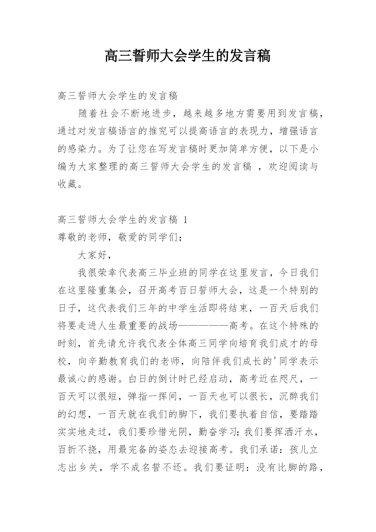 高三誓师大会学生的发言稿高三誓师大会学生的发言稿随着社会不断地进步,越来越多地方需要用到发言稿,通过对发言稿语言的推究可以提高语言的表现力,增强语言的感染力。为了让您在写发言稿时更加简单方便,以下是小编为大家整理的高三誓师大会学生的发言稿,欢迎阅读与收藏。高三誓师大会学生的发言稿1尊敬的老师,敬爱的同学们;大家好,我很荣幸代表高三毕业班的同学在这里发言,今日我们在这里隆重集会,召开高考百日誓师大会,这是一个特别的日子,这代表我们三年的中学生活即将结束,一百天后我们将要走进人生最重要的战场—————高考。在