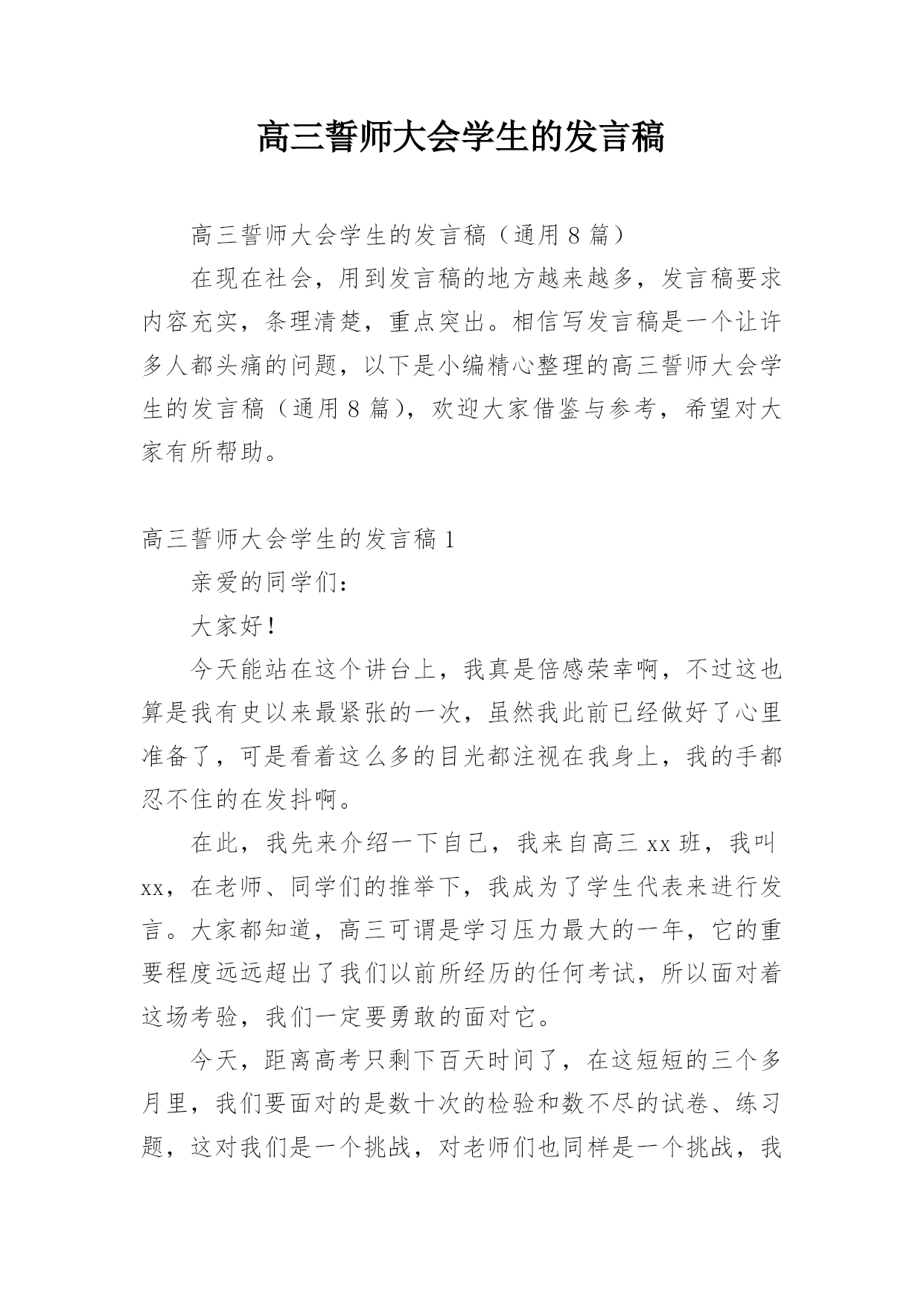 高三誓师大会学生的发言稿高三誓师大会学生的发言稿(通用8篇)在现在社会,用到发言稿的地方越来越多,发言稿要求内容充实,条理清楚,重点突出。相信写发言稿是一个让许多人都头痛的问题,以下是小编精心整理的高三誓师大会学生的发言稿(通用8篇),欢迎大家借鉴与参考,希望对大家有所帮助。高三誓师大会学生的发言稿1亲爱的同学们:大家好!今天能站在这个讲台上,我真是倍感荣幸啊,不过这也算是我有史以来最紧张的一次,虽然我此前已经做好了心里准备了,可是看着这么多的目光都注视在我身上,我的手都忍不住的在发抖啊。在此,我先来介绍