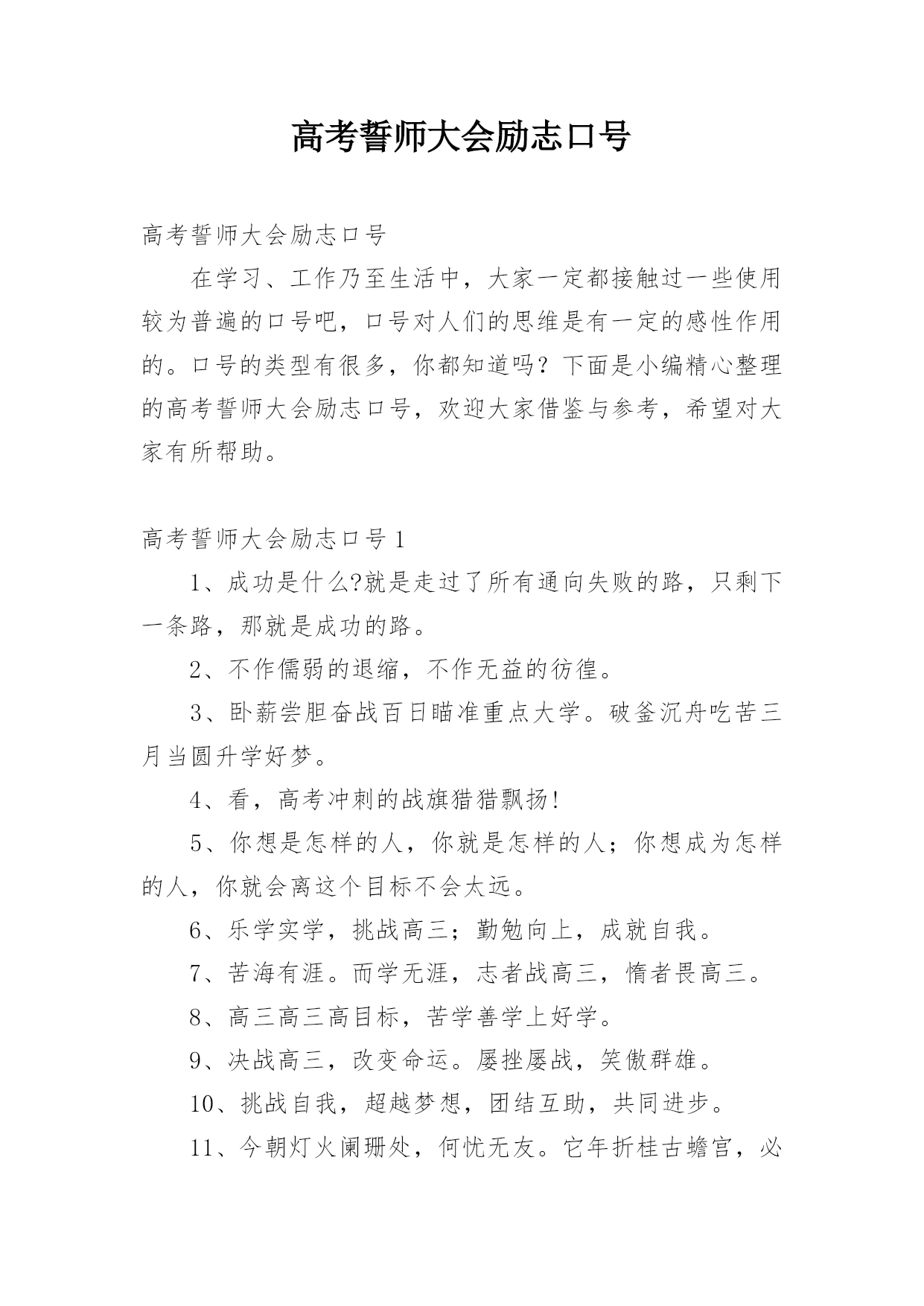 高考誓师大会励志口号高考誓师大会励志口号在日常学习、工作和生活中,大家都知道一些经典的口号吧,口号一般简短有力,富节奏感,指示明确。什么样的口号才经典呢?以下是小编帮大家整理的高考誓师大会励志口号,仅供参考,大家一起来看看吧。高考誓师大会励志口号11、理想是力量的泉源、智慧的摇篮、冲锋的战旗、斩棘的.利剑。2、积极激励我,多劳多收获,汗水育成果。3、别想一下造出大海,必须先由小河川开始。4、今天的付出,明天的美好。5、行者常至,为者常成。6、人生能有几回搏?现在不搏更待何时?珍惜机遇吧,让金色的年华碰撞出