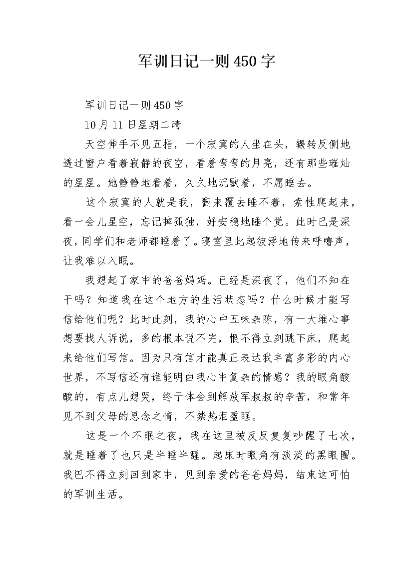 军训日记一则450字军训日记一则450字10月11日星期二晴天空伸手不见五指,一个寂寞的人坐在头,辗转反侧地透过窗户看着寂静的夜空,看着弯弯的月亮,还有那些璀灿的星星。她静静地看着,久久地沉默着,不愿睡去。这个寂寞的人就是我,翻来覆去睡不着,索性爬起来,看一会儿星空,忘记掉孤独,好安稳地睡个觉。此时已是深夜,同学们和老师都睡着了。寝室里此起彼浮地传来呼噜声,让我难以入眠。我想起了家中的爸爸妈妈。已经是深夜了,他们不知在干吗?知道我在这个地方的生活状态吗?什么时候才能写信给他们呢?此时此刻,我的心中五味杂陈