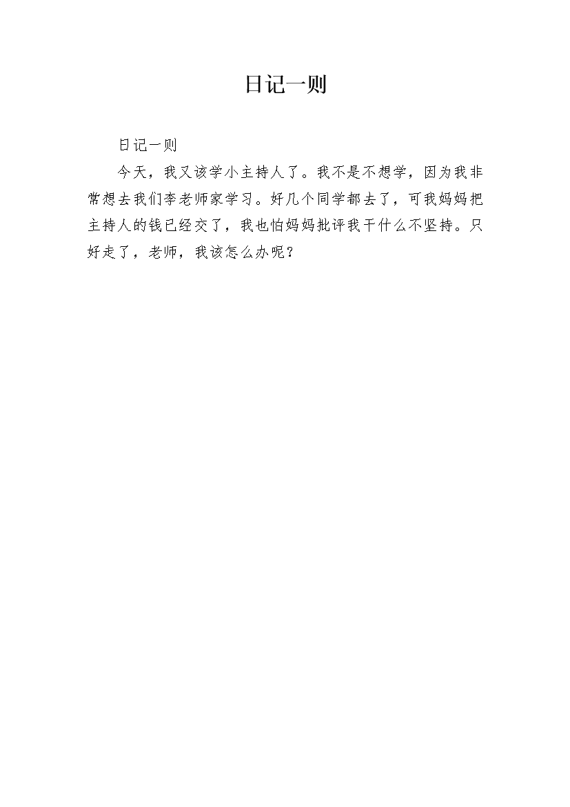 日记一则日记一则今天,我又该学小主持人了。我不是不想学,因为我非常想去我们李老师家学习。好几个同学都去了,可我妈妈把主持人的钱已经交了,我也怕妈妈批评我干什么不坚持。只好走了,老师,我该怎么办呢?