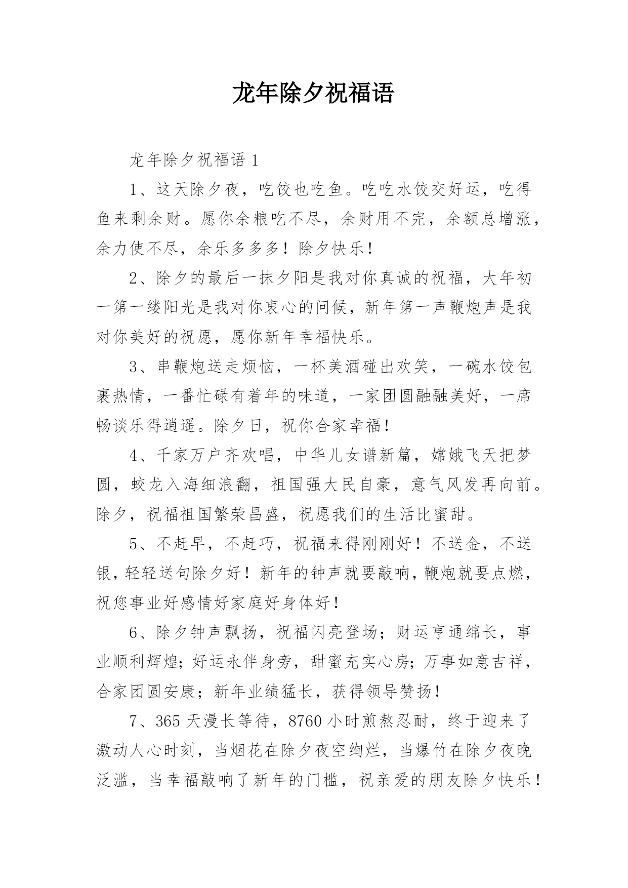龙年除夕祝福语龙年除夕祝福语11、这天除夕夜,吃饺也吃鱼。吃吃水饺交好运,吃得鱼来剩余财。愿你余粮吃不尽,余财用不完,余额总增涨,余力使不尽,余乐多多多!除夕快乐!2、除夕的最后一抹夕阳是我对你真诚的祝福,大年初一第一缕阳光是我对你衷心的问候,新年第一声鞭炮声是我对你美好的祝愿,愿你新年幸福快乐。3、串鞭炮送走烦恼,一杯美酒碰出欢笑,一碗水饺包裹热情,一番忙碌有着年的味道,一家团圆融融美好,一席畅谈乐得逍遥。除夕日,祝你合家幸福!4、千家万户齐欢唱,中华儿女谱新篇,嫦娥飞天把梦圆,蛟龙入海细浪翻,祖国强大