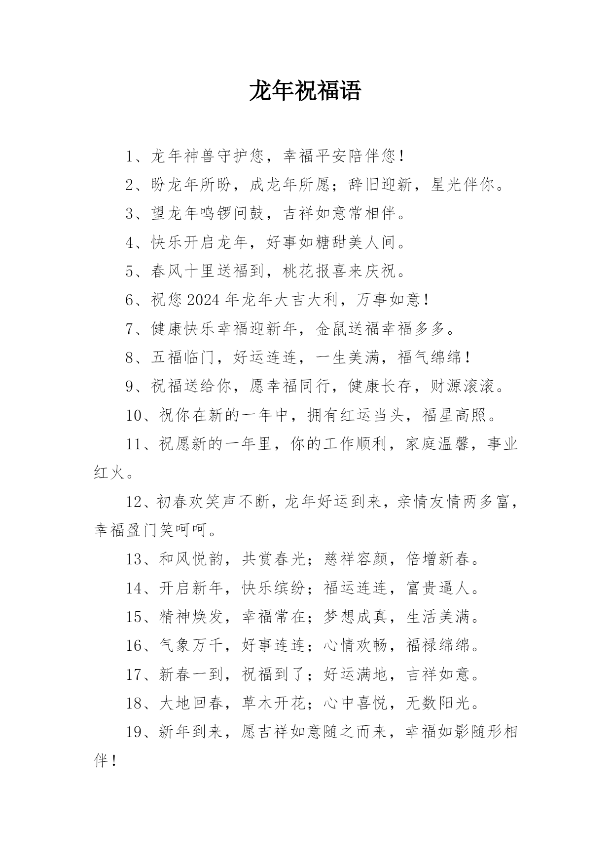 龙年祝福语1、龙年神兽守护您,幸福平安陪伴您!2、盼龙年所盼,成龙年所愿;辞旧迎新,星光伴你。3、望龙年鸣锣问鼓,吉祥如意常相伴。4、快乐开启龙年,好事如糖甜美人间。5、春风十里送福到,桃花报喜来庆祝。6、祝您2024年龙年大吉大利,万事如意!7、健康快乐幸福迎新年,金鼠送福幸福多多。8、五福临门,好运连连,一生美满,福气绵绵!9、祝福送给你,愿幸福同行,健康长存,财源滚滚。10、祝你在新的一年中,拥有红运当头,福星高照。11、祝愿新的一年里,你的工作顺利,家庭温馨,事业红火。12、初春欢笑声不断,龙年好