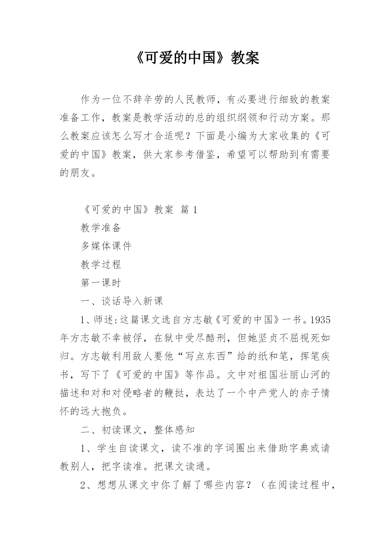 《可爱的中国》教案作为一位不辞辛劳的人民教师,有必要进行细致的教案准备工作,教案是教学活动的总的组织纲领和行动方案。那么教案应该怎么写才合适呢?下面是小编为大家收集的《可爱的中国》教案,供大家参考借鉴,希望可以帮助到有需要的朋友。《可爱的中国》教案篇1教学准备多媒体课件教学过程第一课时一、谈话导入新课1、师述:这篇课文选自方志敏《可爱的中国》一书。1935年方志敏不幸被俘,在狱中受尽酷刑,但她坚贞不屈视死如归。方志敏利用敌人要他“写点东西”给的纸和笔,挥笔疾书,写下了《可爱的中国》等作品。文中对祖国壮丽山