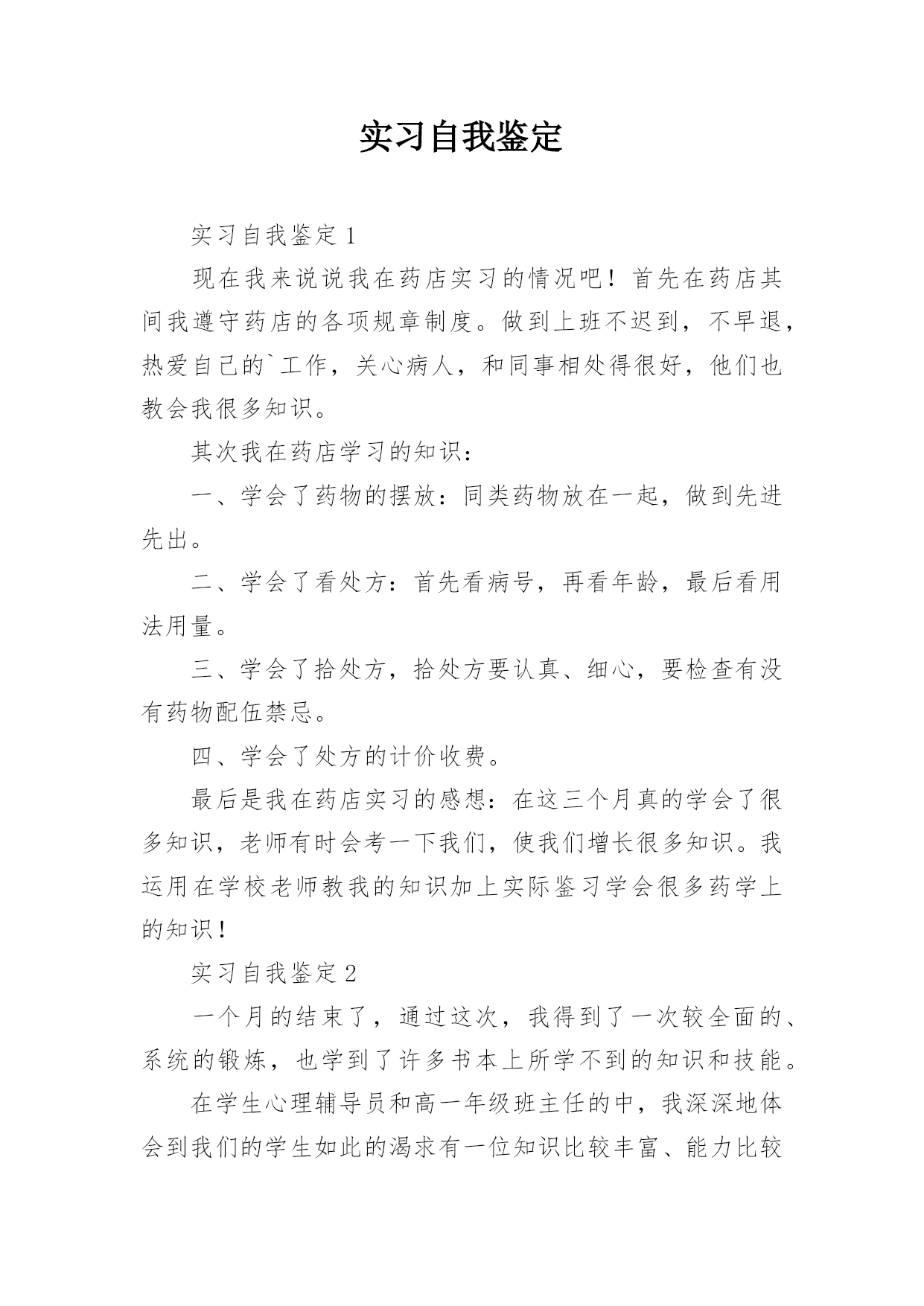 实习自我鉴定实习自我鉴定1现在我来说说我在药店实习的情况吧!首先在药店其间我遵守药店的各项规章制度。做到上班不迟到,不早退,热爱自己的`工作,关心病人,和同事相处得很好,他们也教会我很多知识。其次我在药店学习的知识:一、学会了药物的摆放:同类药物放在一起,做到先进先出。二、学会了看处方:首先看病号,再看年龄,最后看用法用量。三、学会了拾处方,拾处方要认真、细心,要检查有没有药物配伍禁忌。四、学会了处方的计价收费。最后是我在药店实习的感想:在这三个月真的学会了很多知识,老师有时会考一下我们,使我们增长很多知