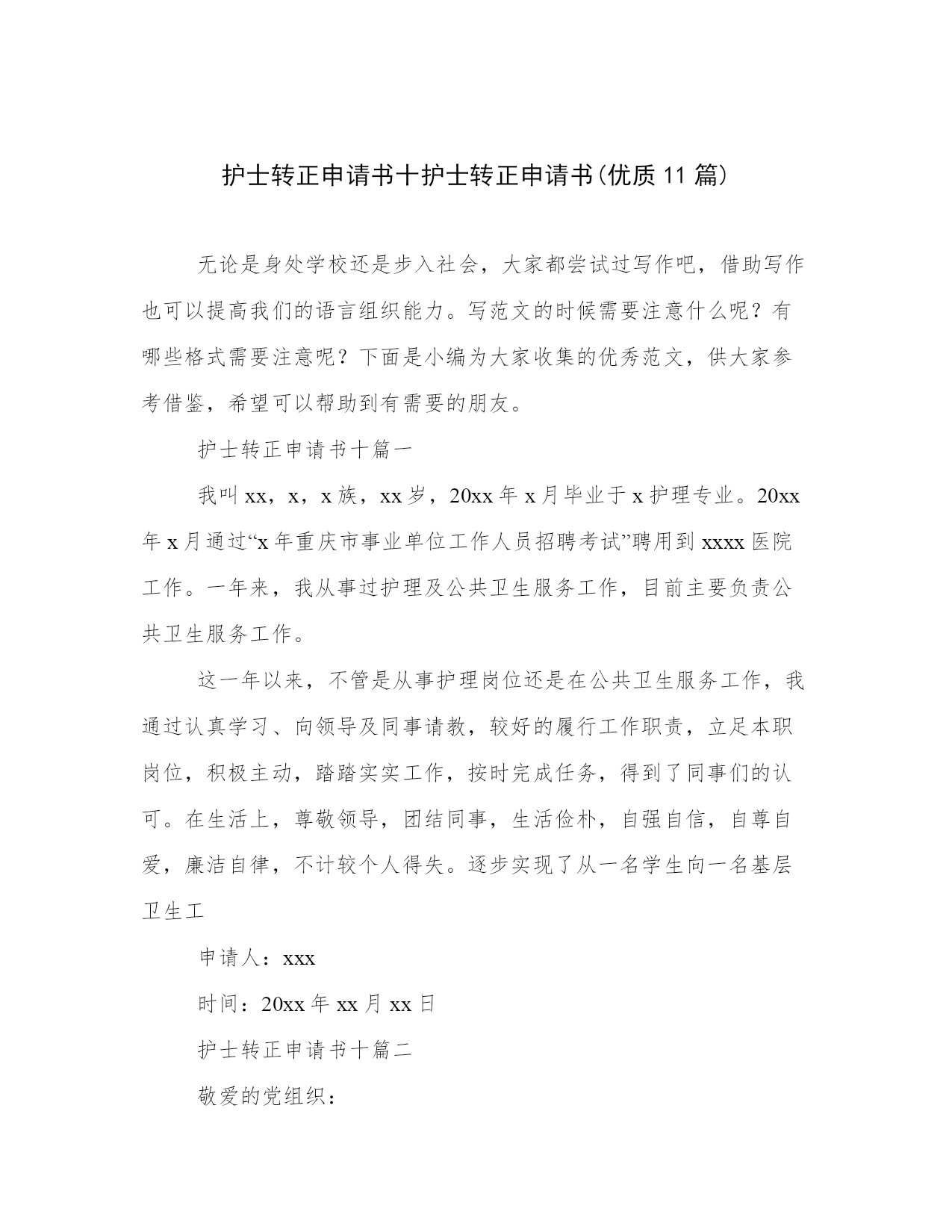 护士转正申请书十护士转正申请书(优质11篇)无论是身处学校还是步入社会,大家都尝试过写作吧,借助写作也可以提高我们的语言组织能力。写范文的时候需要注意什么呢?有哪些格式需要注意呢?下面是小编为大家收集的优秀范文,供大家参考借鉴,希望可以帮助到有需要的朋友。护士转正申请书十篇一我叫xx,x,x族,xx岁,20xx年x月毕业于x护理专业。20xx年x月通过“x年重庆市事业单位工作人员招聘考试”聘用到xxxx医院工作。一年来,我从事过护理及公共卫生服务工作,目前主要负责公共卫生服务工作。这一年以来,不管是从事护