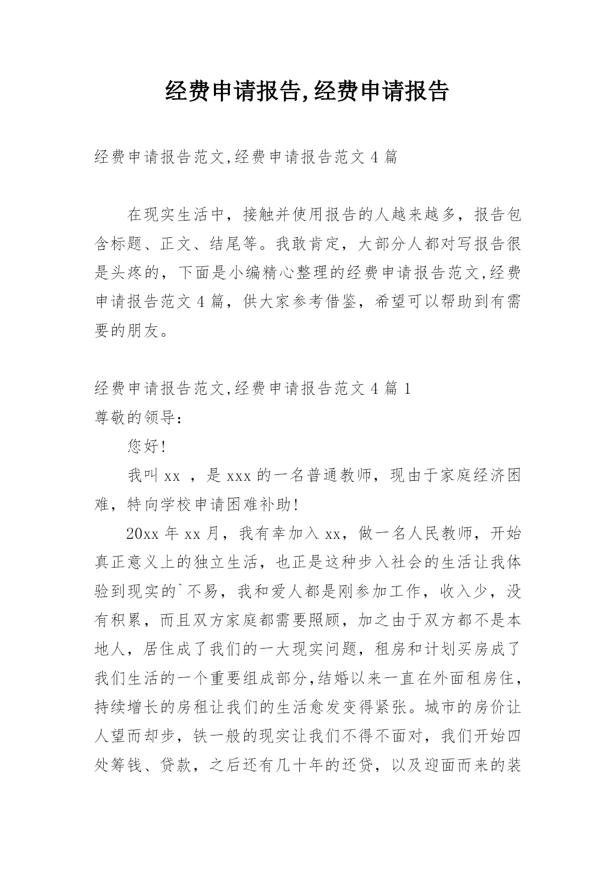 经费申请报告,经费申请报告经费申请报告范文,经费申请报告范文4篇在现实生活中,接触并使用报告的人越来越多,报告包含标题、正文、结尾等。我敢肯定,大部分人都对写报告很是头疼的,下面是小编精心整理的经费申请报告范文,经费申请报告范文4篇,供大家参考借鉴,希望可以帮助到有需要的朋友。经费申请报告范文,经费申请报告范文4篇1尊敬的领导:您好!我叫xx,是xxx的一名普通教师,现由于家庭经济困难,特向学校申请困难补助!20xx年xx月,我有幸加入xx,做一名人民教师,开始真正意义上的独立生活,也正是这种步入社会的生