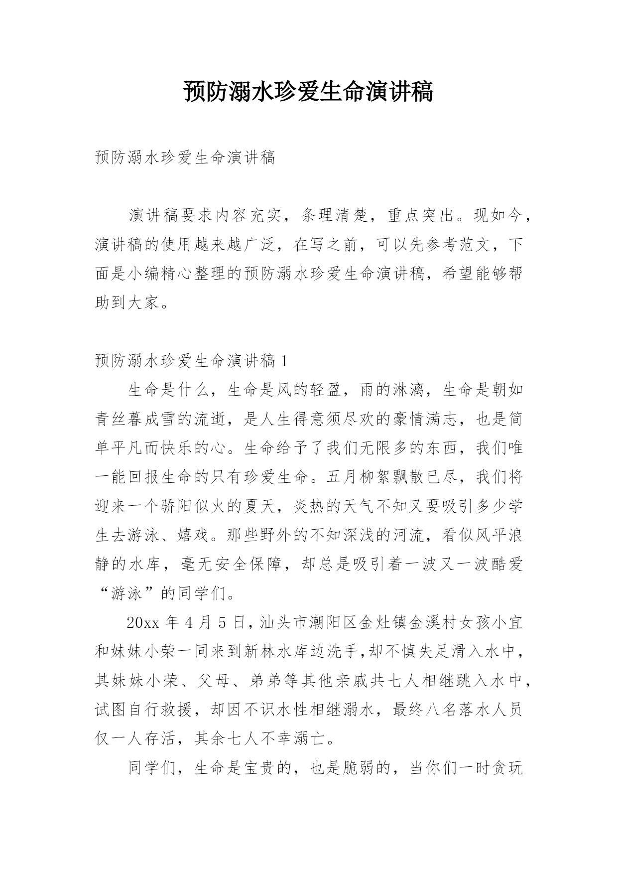 预防溺水珍爱生命演讲稿预防溺水珍爱生命演讲稿演讲稿要求内容充实,条理清楚,重点突出。现如今,演讲稿的使用越来越广泛,在写之前,可以先参考范文,下面是小编精心整理的预防溺水珍爱生命演讲稿,希望能够帮助到大家。预防溺水珍爱生命演讲稿1生命是什么,生命是风的轻盈,雨的淋漓,生命是朝如青丝暮成雪的流逝,是人生得意须尽欢的豪情满志,也是简单平凡而快乐的心。生命给予了我们无限多的东西,我们唯一能回报生命的只有珍爱生命。五月柳絮飘散已尽,我们将迎来一个骄阳似火的夏天,炎热的天气不知又要吸引多少学生去游泳、嬉戏。那些野外
