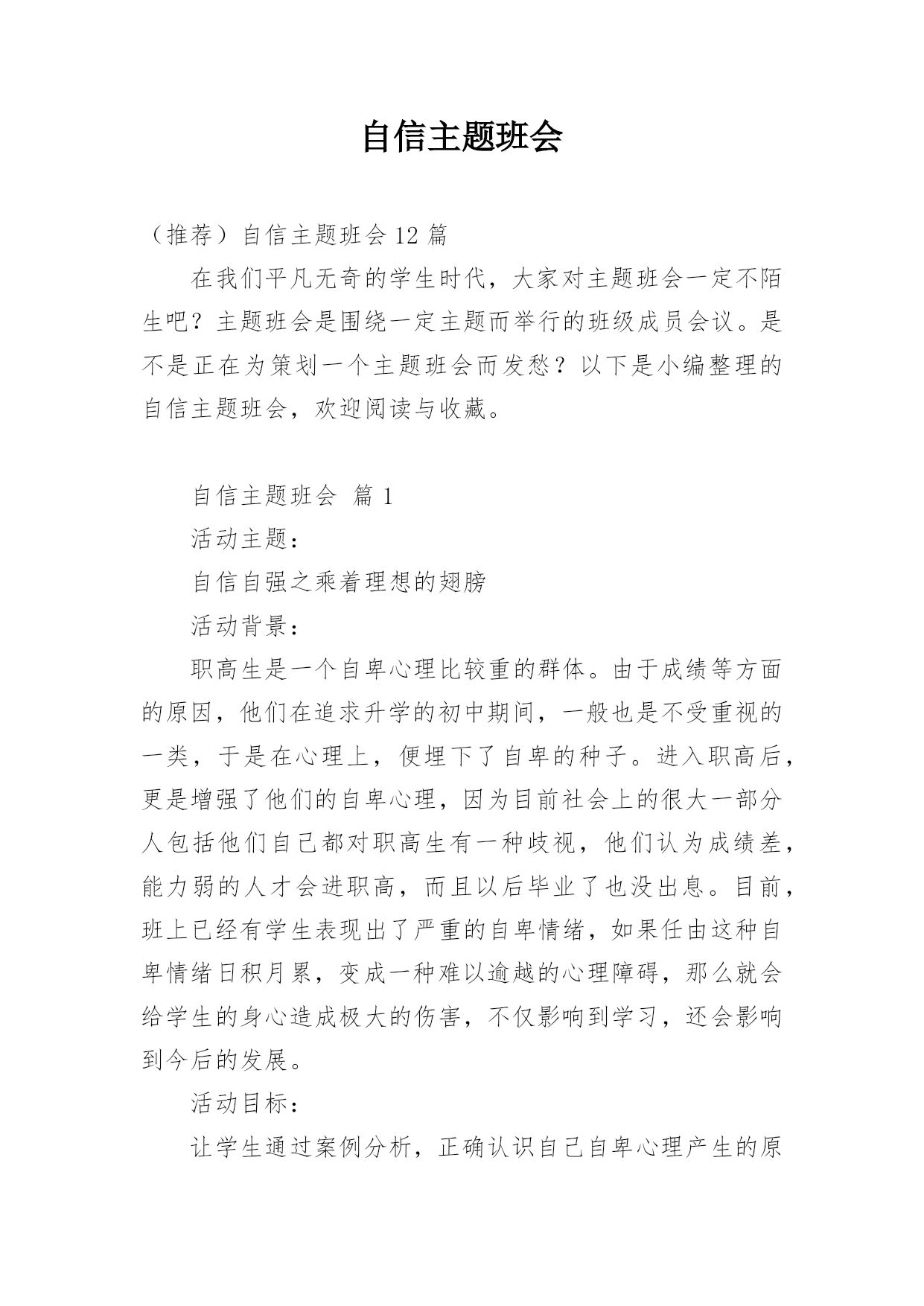 自信主题班会(推荐)自信主题班会12篇在我们平凡无奇的学生时代,大家对主题班会一定不陌生吧?主题班会是围绕一定主题而举行的班级成员会议。是不是正在为策划一个主题班会而发愁?以下是小编整理的自信主题班会,欢迎阅读与收藏。自信主题班会篇1活动主题:自信自强之乘着理想的翅膀活动背景:职高生是一个自卑心理比较重的群体。由于成绩等方面的原因,他们在追求升学的初中期间,一般也是不受重视的一类,于是在心理上,便埋下了自卑的种子。进入职高后,更是增强了他们的自卑心理,因为目前社会上的很大一部分人包括他们自己都对职高生有一
