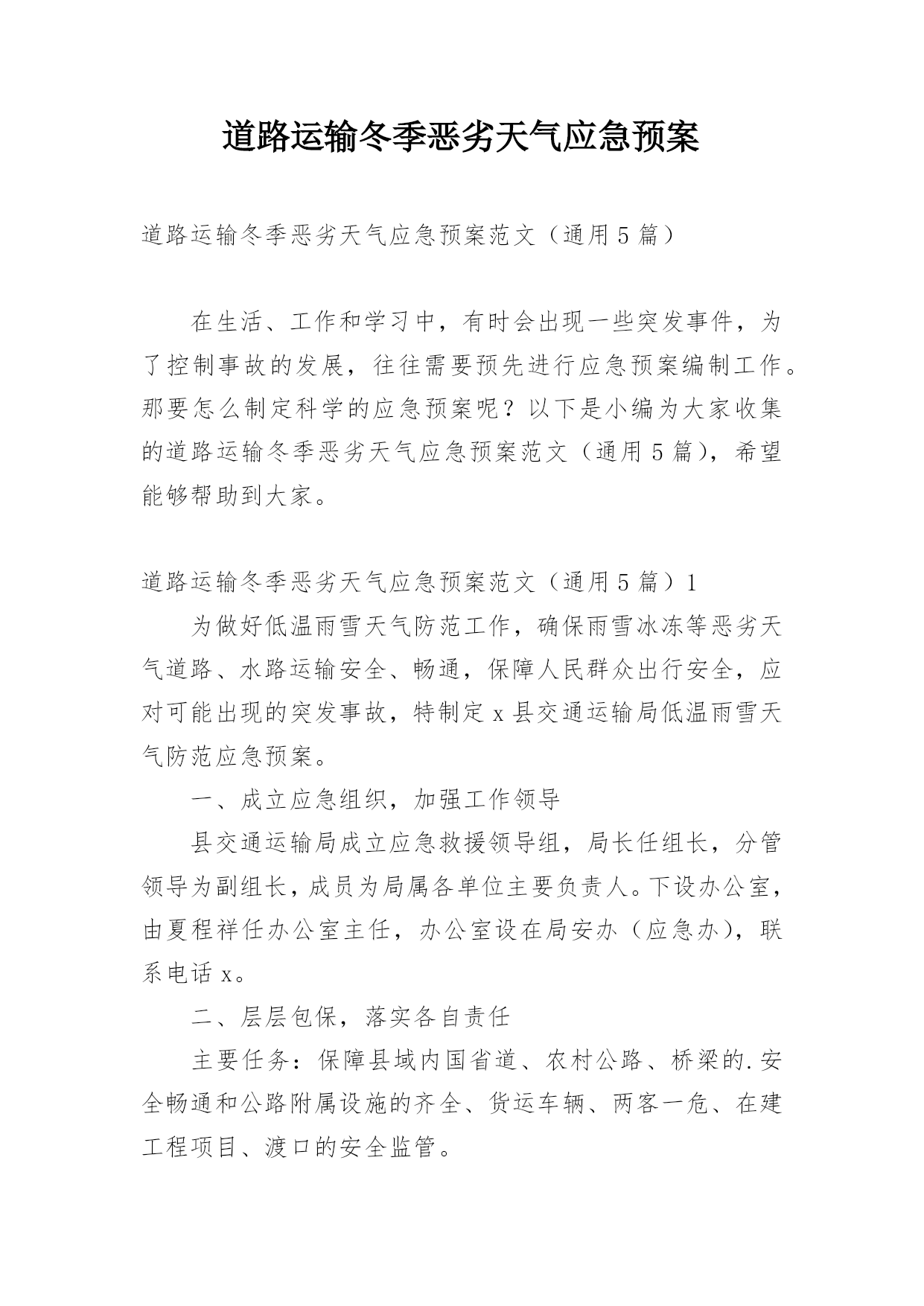 道路运输冬季恶劣天气应急预案道路运输冬季恶劣天气应急预案范文(通用5篇)在生活、工作和学习中,有时会出现一些突发事件,为了控制事故的发展,往往需要预先进行应急预案编制工作。那要怎么制定科学的应急预案呢?以下是小编为大家收集的道路运输冬季恶劣天气应急预案范文(通用5篇),希望能够帮助到大家。道路运输冬季恶劣天气应急预案范文(通用5篇)1为做好低温雨雪天气防范工作,确保雨雪冰冻等恶劣天气道路、水路运输安全、畅通,保障人民群众出行安全,应对可能出现的突发事故,特制定x县交通运输局低温雨雪天气防范应急预案。一、成