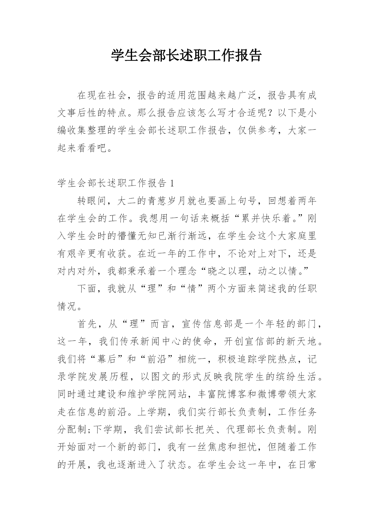 学生会部长述职工作报告在现在社会,报告的适用范围越来越广泛,报告具有成文事后性的特点。那么报告应该怎么写才合适呢?以下是小编收集整理的学生会部长述职工作报告,仅供参考,大家一起来看看吧。学生会部长述职工作报告1转眼间,大二的青葱岁月就也要画上句号,回想着两年在学生会的工作。我想用一句话来概括“累并快乐着。”刚入学生会时的懵懂无知已渐行渐远,在学生会这个大家庭里有艰辛更有收获。在近一年的工作中,不论对上对下,还是对内对外,我都秉承着一个理念“晓之以理,动之以情。”下面,我就从“理”和“情”两个方面来简述我的