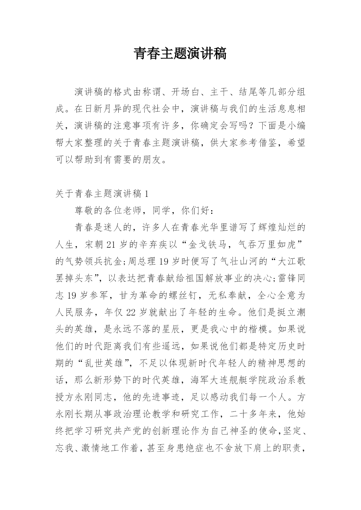 青春主题演讲稿演讲稿的格式由称谓、开场白、主干、结尾等几部分组成。在日新月异的现代社会中,演讲稿与我们的生活息息相关,演讲稿的注意事项有许多,你确定会写吗?下面是小编帮大家整理的关于青春主题演讲稿,供大家参考借鉴,希望可以帮助到有需要的朋友。关于青春主题演讲稿1尊敬的各位老师,同学,你们好:青春是迷人的,许多人在青春光华里谱写了辉煌灿烂的人生,宋朝21岁的辛弃疾以“金戈铁马,气吞万里如虎”的气势领兵抗金;周总理19岁时便写了气壮山河的“大江歌罢掉头东”,以表达把青春献给祖国解放事业的决心;雷锋同志19岁参