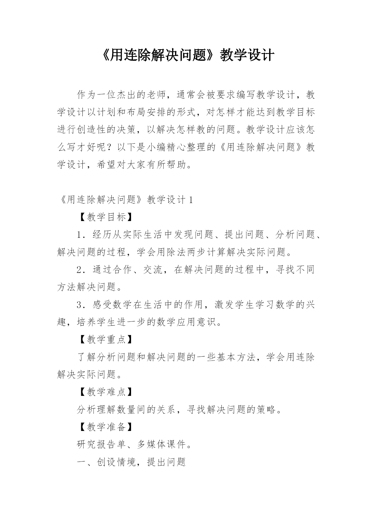 《用连除解决问题》教学设计作为一位杰出的老师,通常会被要求编写教学设计,教学设计以计划和布局安排的形式,对怎样才能达到教学目标进行创造性的决策,以解决怎样教的问题。教学设计应该怎么写才好呢?以下是小编精心整理的《用连除解决问题》教学设计,希望对大家有所帮助。《用连除解决问题》教学设计1【教学目标】1.经历从实际生活中发现问题、提出问题、分析问题、解决问题的过程,学会用除法两步计算解决实际问题。2.通过合作、交流,在解决问题的过程中,寻找不同方法解决问题。3.感受数学在生活中的作用,激发学生学习数学的兴趣,