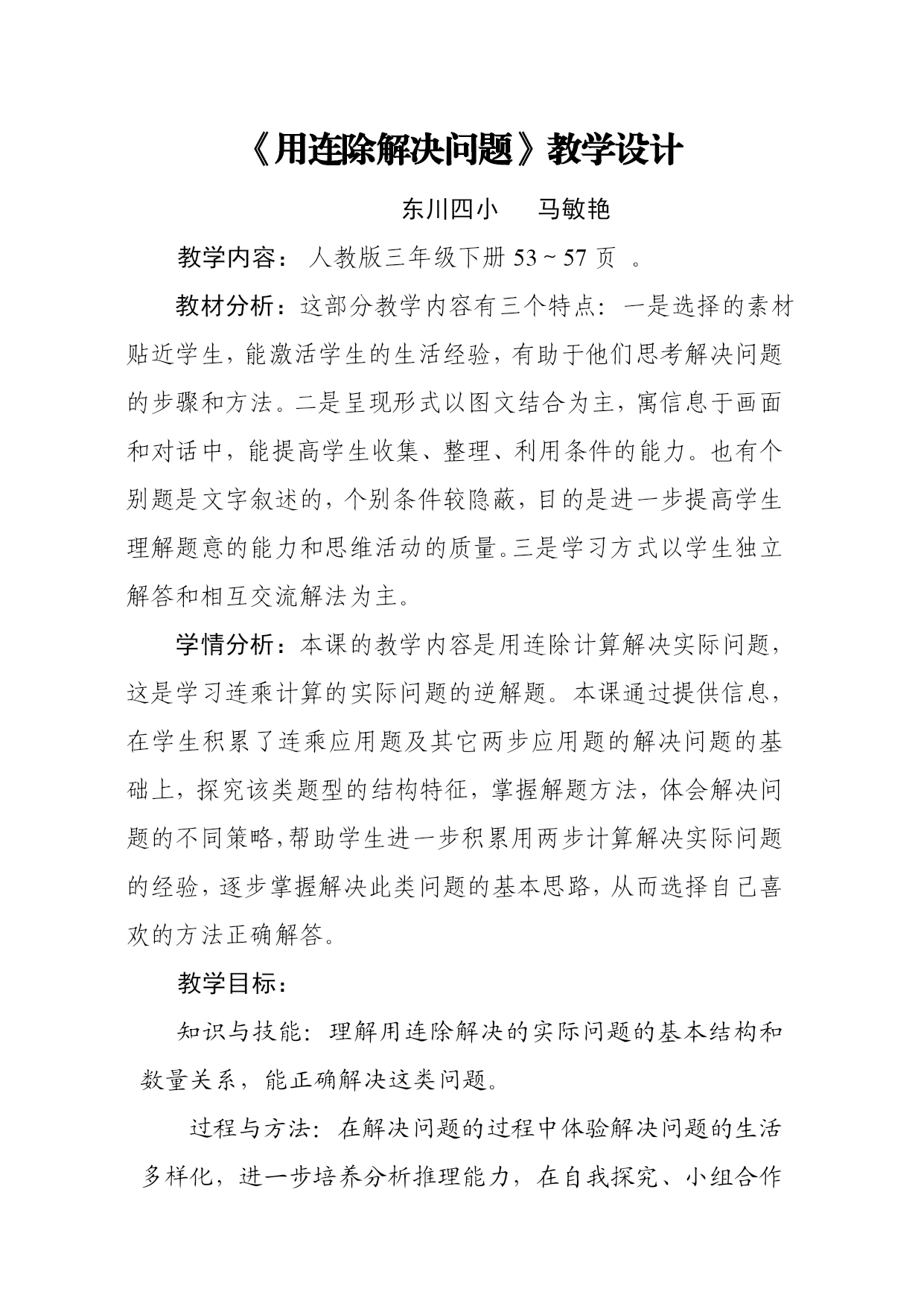 《用连除解决问题》教学设计东川四小马敏艳教学内容:人教版三年级下册53~57页。教材分析:这部分教学内容有三个特点:一是选择的素材贴近学生,能激活学生的生活经验,有助于他们思考解决问题的步骤和方法。二是呈现形式以图文结合为主,寓信息于画面和对话中,能提高学生收集、整理、利用条件的能力。也有个别题是文字叙述的,个别条件较隐蔽,目的是进一步提高学生理解题意的能力和思维活动的质量。三是学习方式以学生独立解答和相互交流解法为主。学情分析:本课的教学内容是用连除计算解决实际问题,这是学习连乘计算的实际问题的逆解题。