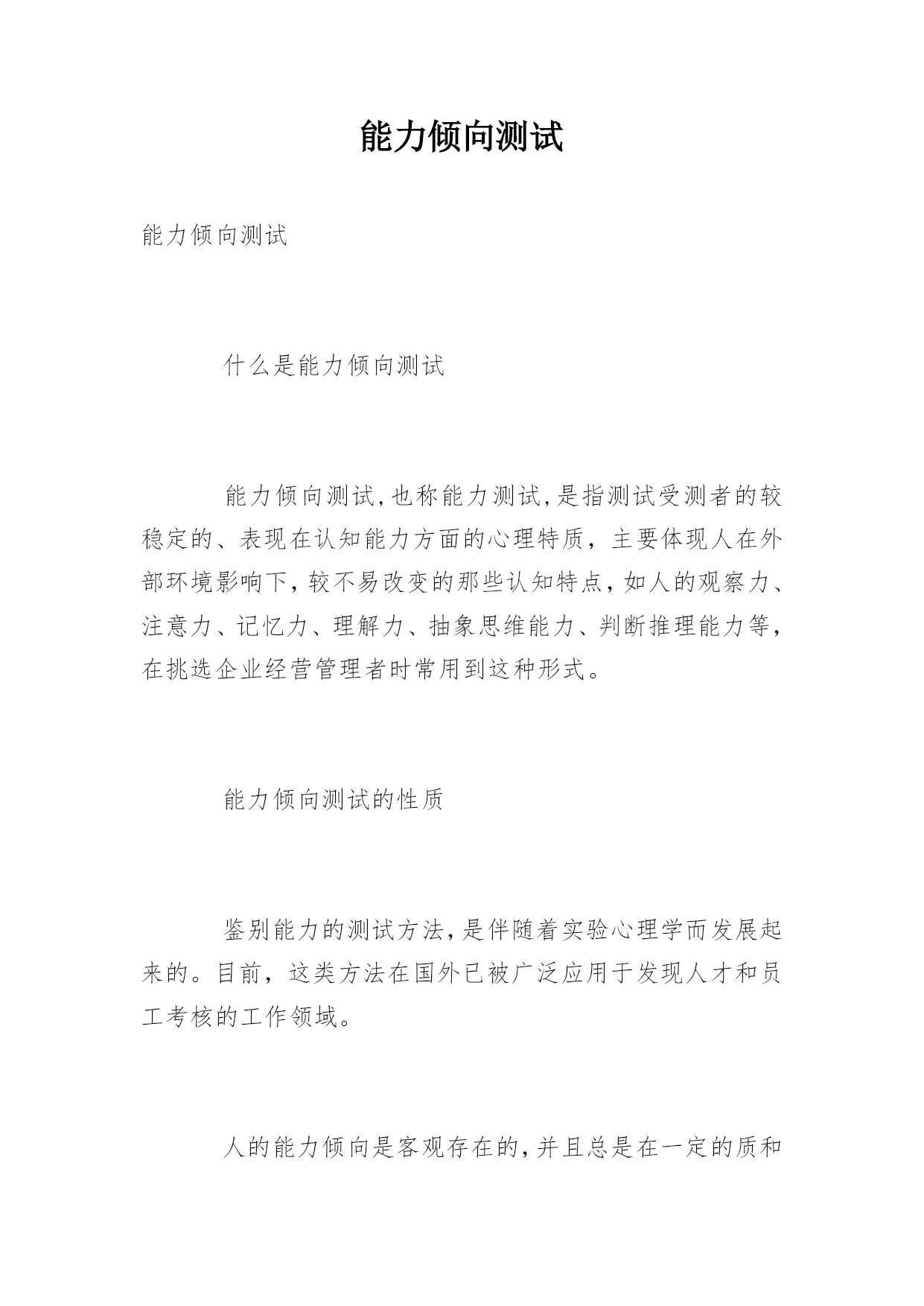 能力倾向测试能力倾向测试什么是能力倾向测试能力倾向测试,也称能力测试,是指测试受测者的较稳定的、表现在认知能力方面的心理特质,主要体现人在外部环境影响下,较不易改变的那些认知特点,如人的观察力、注意力、记忆力、理解力、抽象思维能力、判断推理能力等,在挑选企业经营管理者时常用到这种形式。能力倾向测试的性质鉴别能力的测试方法,是伴随着实验心理学而发展起来的。目前,这类方法在国外已被广泛应用于发现人才和员工考核的工作领域。人的能力倾向是客观存在的,并且总是在一定的质和量的界限中表现出来。因而对于人的能力结构和倾