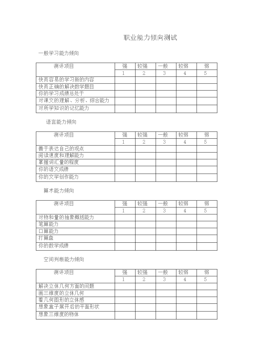 编号:时间:2021年x月x日书山有路勤为径,学海无涯苦作舟页码:职业能力倾向测试一般学习能力倾向测评项目强较强一般较弱弱12345快而容易的学习新的内容快而正确的解决数学题目你的学习成绩总处于对课文的理解、分析、综合能力对所学知识的记忆能力语言能力倾向测评项目强较强一般较弱弱12345善于表达自己的观点阅读速度和理解能力掌握词汇量的程度你的语文成绩你的文学创作能力算术能力倾向测评项目强较强一般较弱弱12345对物和量的抽象概括能力笔算能力口算能力打算盘你的数学成绩空间判断能力倾向测评项目强较
