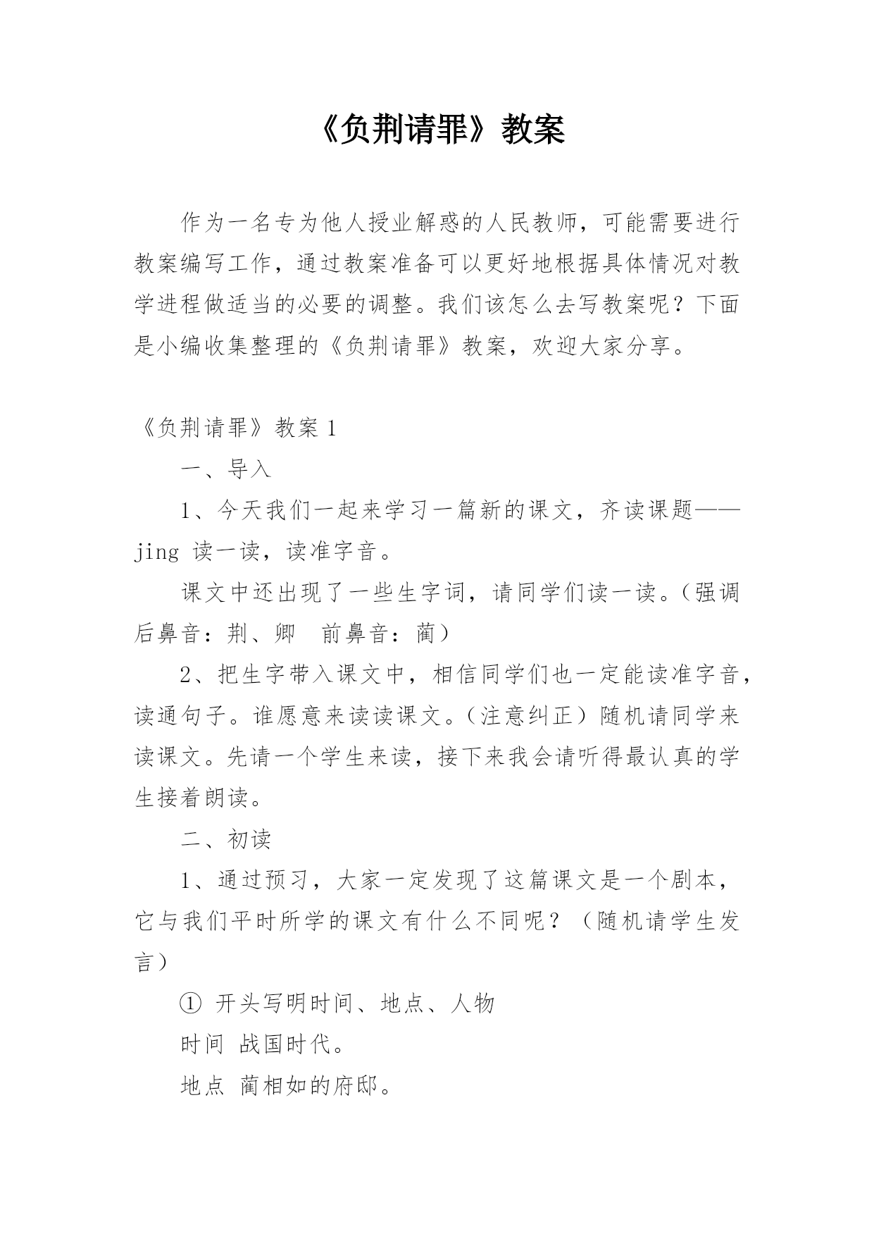 《负荆请罪》教案作为一名专为他人授业解惑的人民教师,可能需要进行教案编写工作,通过教案准备可以更好地根据具体情况对教学进程做适当的必要的调整。我们该怎么去写教案呢?下面是小编收集整理的《负荆请罪》教案,欢迎大家分享。《负荆请罪》教案1一、导入1、今天我们一起来学习一篇新的课文,齐读课题——jing读一读,读准字音。课文中还出现了一些生字词,请同学们读一读。(强调后鼻音:荆、卿前鼻音:蔺)2、把生字带入课文中,相信同学们也一定能读准字音,读通句子。谁愿意来读读课文。(注意纠正)随机请同学来读课文。先请一个学